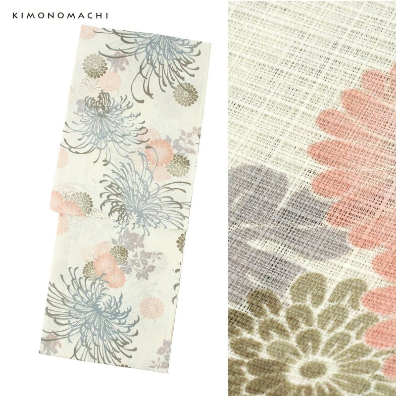 アイボリーの地に、グレーと抹茶色のぼかしの入った大きな糸菊の花。コーラルピンクや抹茶色、淡い桃色の菊の花紋にウォームグレーの葉。糸菊の繊細な華やかさと優しい配色が落ち着いたかわいらしい雰囲気です。