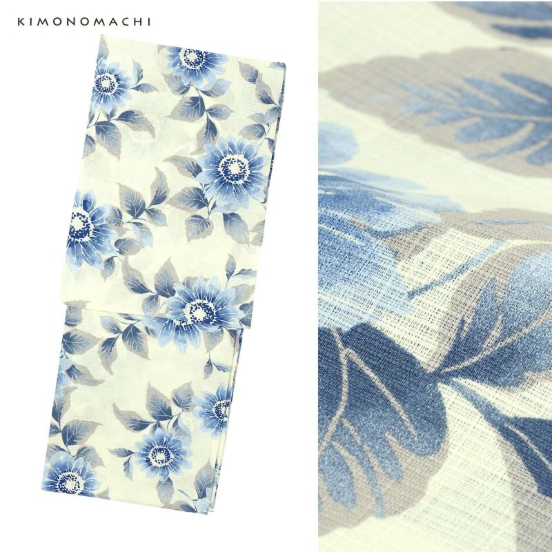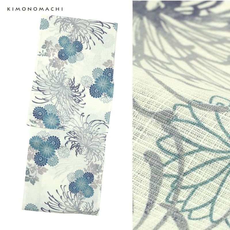 アイボリーの地に、グレーと青紫のぼかしの入った大きな糸菊の花。紺や浅葱色、ブルーグレーの菊の花紋にグレーの葉。糸菊の繊細な華やかさとシックな配色が大人っぽい雰囲気です。
