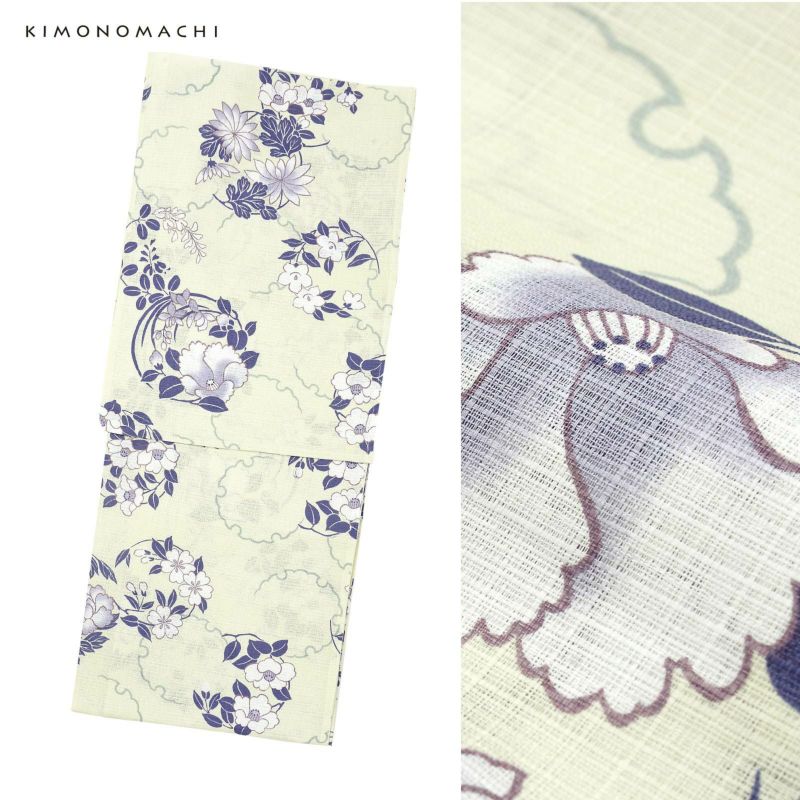 アイボリーの地に青灰色の雪輪。白に淡い青みのパープル、青みの濃鼠色で表現された椿や蘭、萩に桔梗、牡丹、桜などの四季の花の丸文様。古典的な文様と現代的な色彩の組み合わせが魅力です。