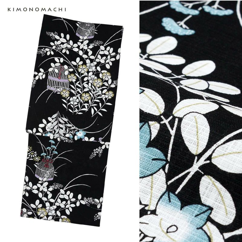 黒地に白抜きで表現された萩や桔梗、撫子、芝草の秋草文様にグレイッシュな淡いブルーや浅い抹茶色の挿し色。白に藤色、臙脂の紐を添えた虫かごが物語を感じさせます。