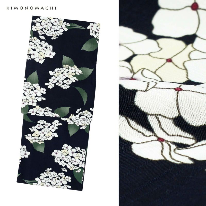 03.アジサイ ディープネイビー:濃紺の地にオフホワイトと淡いベージュのアジサイの花、グレイッシュな深緑のぼかしの葉。花びらの淡い紫のぼかしに蕊の深紅色が上品なアクセントとなっています。