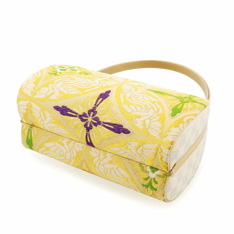 バッグの表裏、草履の鼻緒は、ゴールドに白に向い鳳凰紋が配された七宝文様。白、珊瑚色、緑、濃紫などの花菱。側面は白とゴールドの市松文様。草履の台は、天はマットゴールド、芯の巻は白とマットゴールド。
