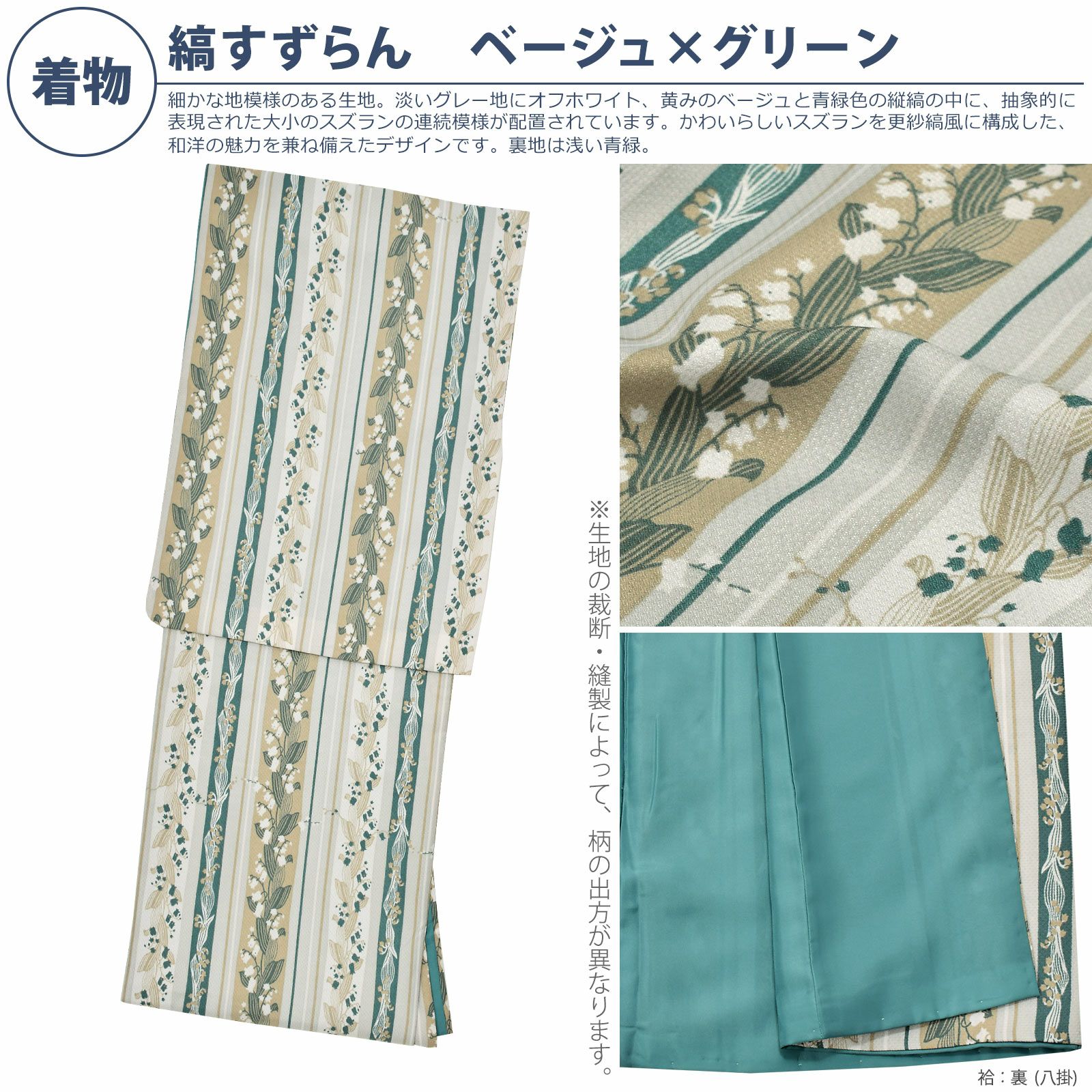 他の画像を見る 送料無料 【2023-2024年新作】KIMONOMACHI オリジナル!きもの福袋 個性派洗える着物 レトロモダン 古典柄 アンティーク着物風 洗える着物 セット「袷着物:縞すずらん ベージュ×グリーン+京袋帯:青緑色 九官鳥」KIMONOMACHI オリジナル 着物と帯と帯揚げと丸ぐけの4点セット サイズS/M/L/LL 2023-2024新作 コーディネート済み着物セット 小紋 レディース キモノ【メール便不可】 きもの町価格 ¥ 30,690 税込 在庫切れ 詳細を見る お気に入りに登録する