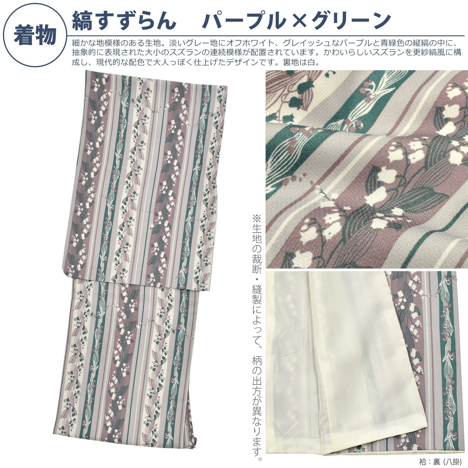他の画像を見る 送料無料 【2023-2024年新作】KIMONOMACHI オリジナル!きもの福袋 個性派洗える着物 レトロモダン 古典柄 アンティーク着物風 洗える着物 セット「袷着物:縞すずらん パープル×グリーン+京袋帯:焦茶色 スクエアレース」KIMONOMACHI オリジナル 着物と帯と帯揚げと丸ぐけの4点セット サイズS/M/L/LL 2023-2024新作 コーディネート済み着物セット 小紋 レディース キモノ【メール便不可】 きもの町価格 ¥ 30,690 税込 在庫切れ 詳細を見る お気に入りに登録する