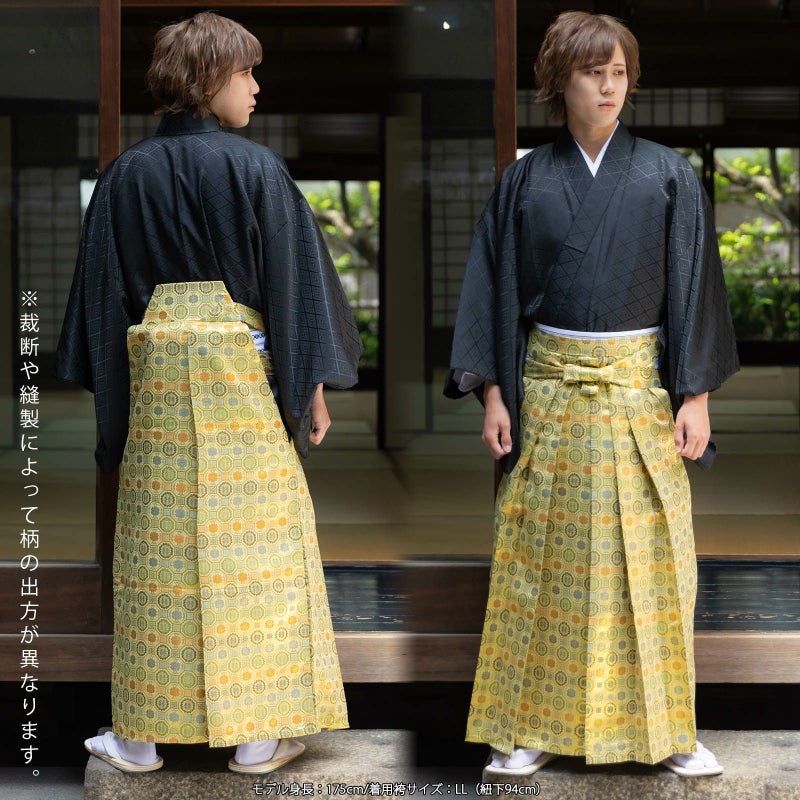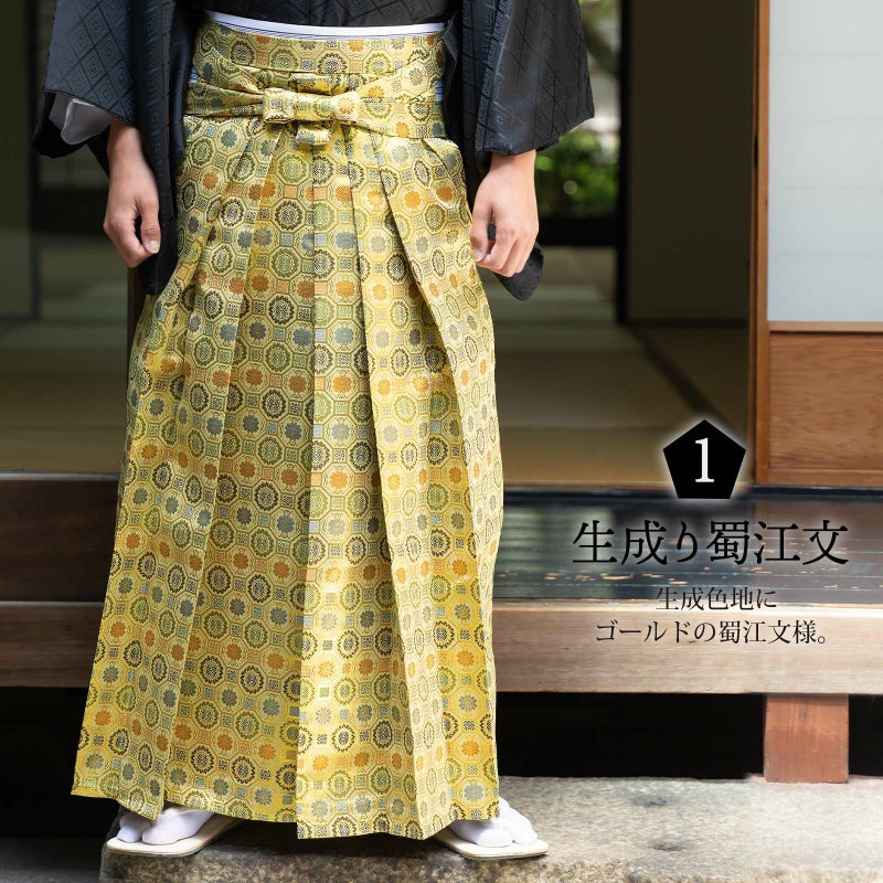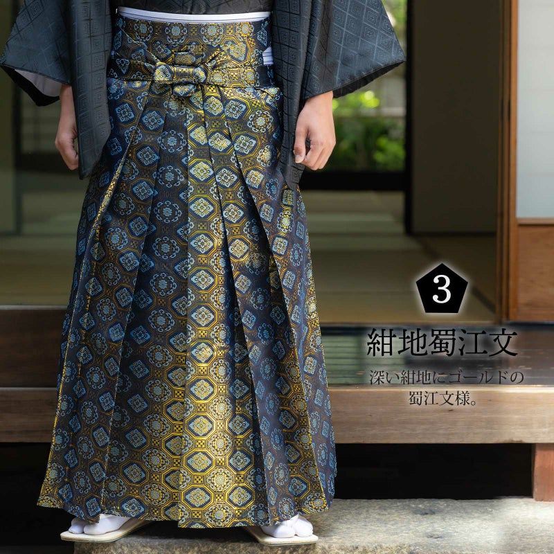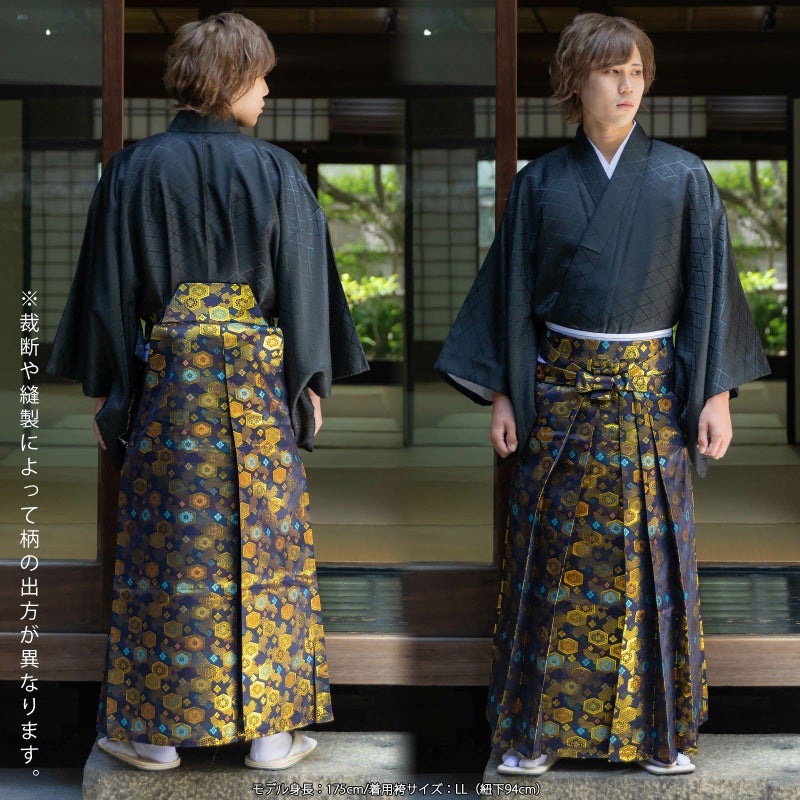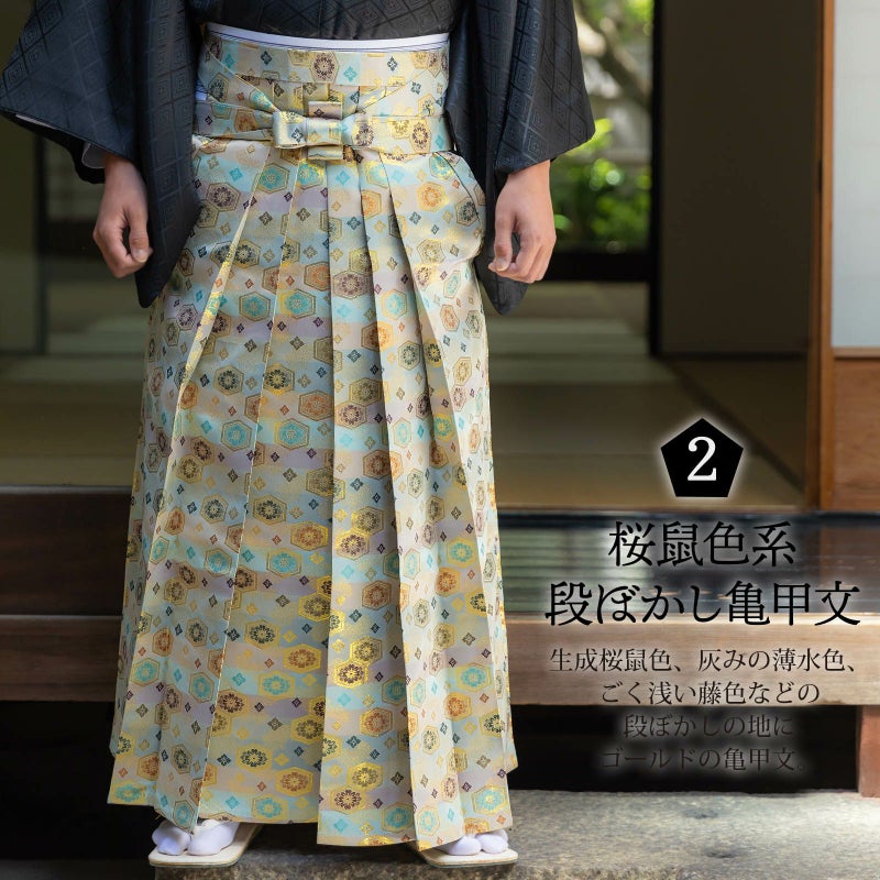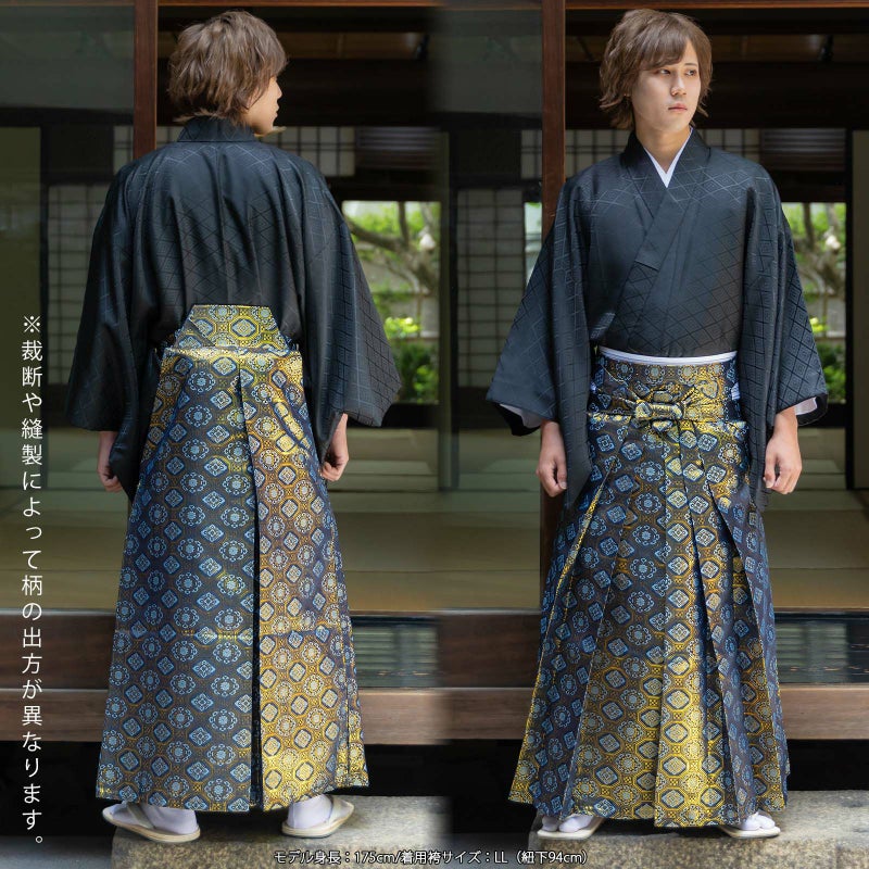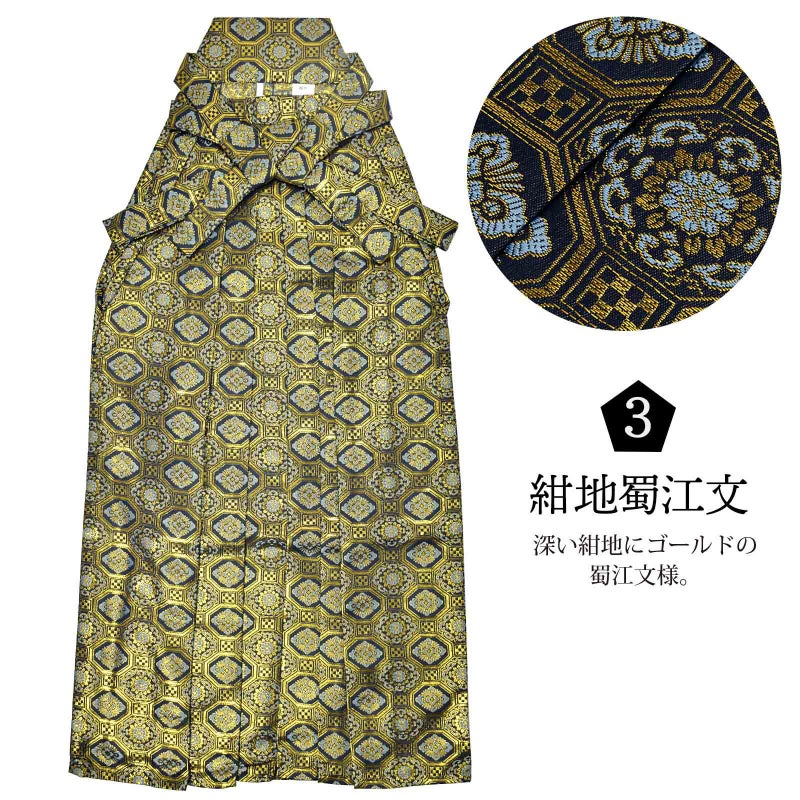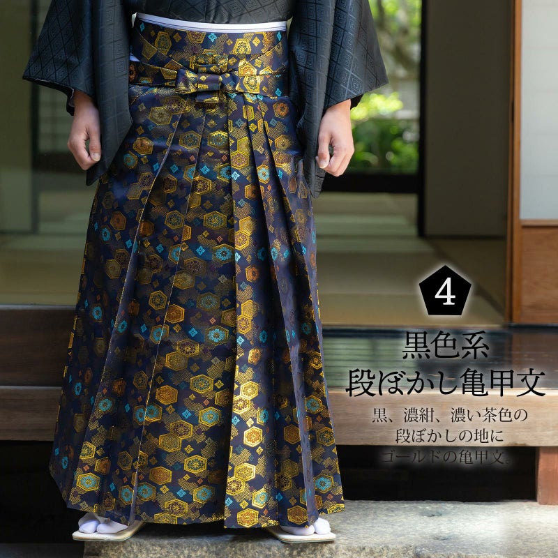 3. 袴 金襴袴 男性袴 馬乗り袴 単品「生成り蜀江文・桜鼠色系段ぼかし亀甲文・紺地蜀江文・黒色系段ぼかし亀甲文」4サイズ S/M/L/LL 身長150cm~180cmまで フォーマル 成人式 卒業式 結婚式 男性 メンズ 晴れ着【メール便不可】