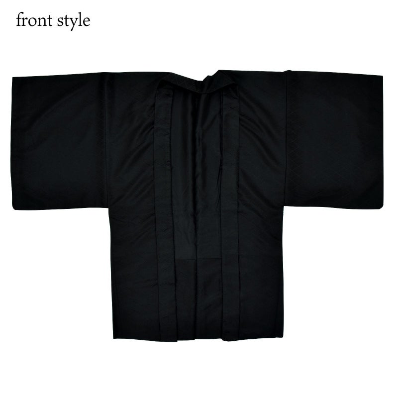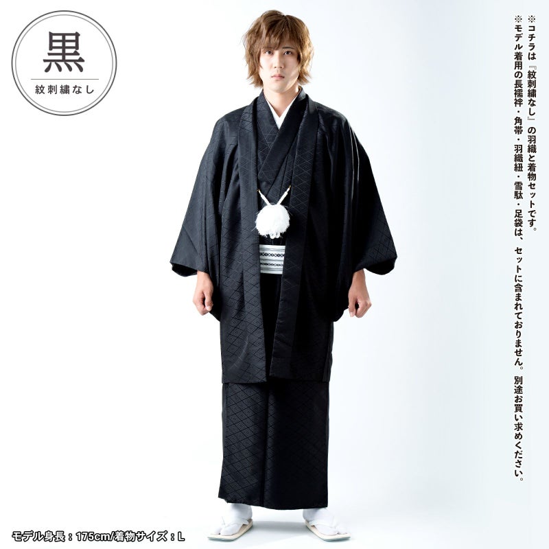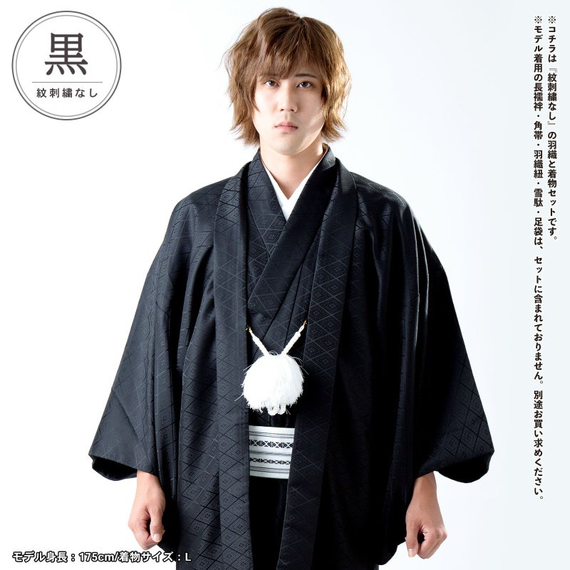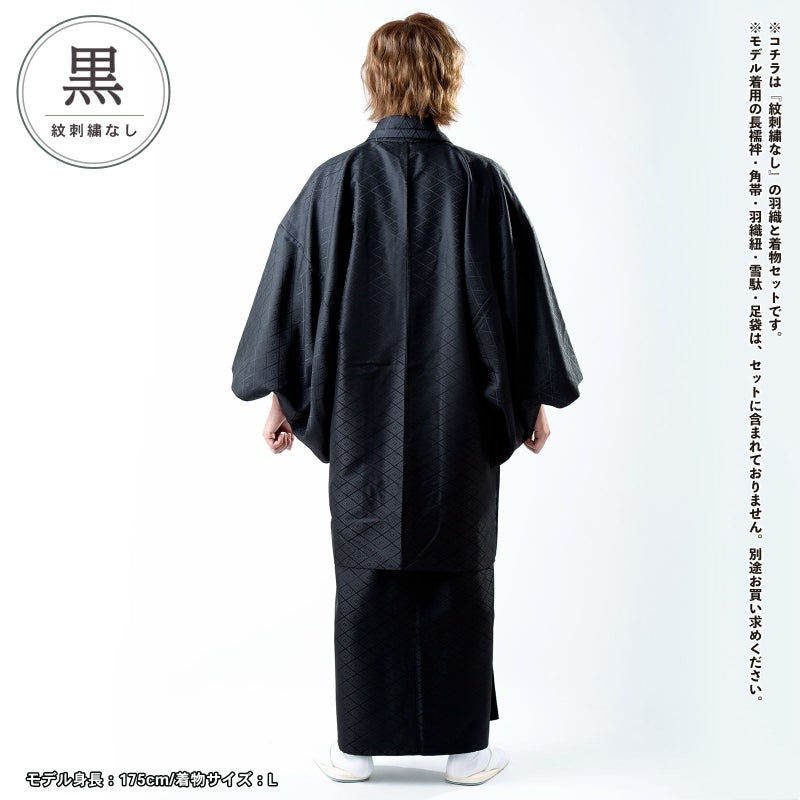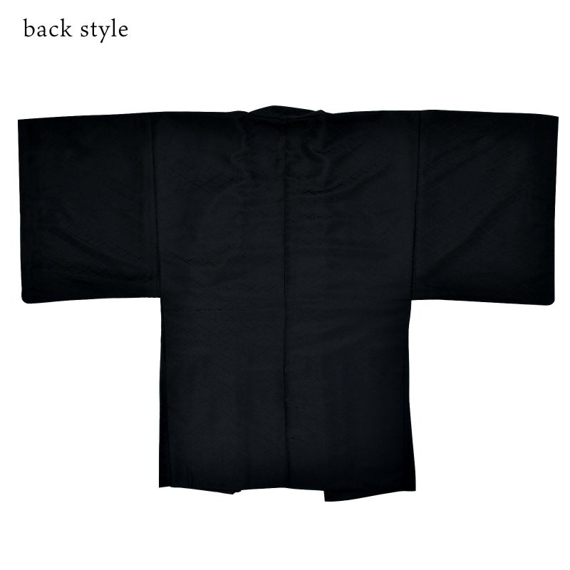 黒 菱…羽織は黒。入れ子菱に花菱の地模様が織り出されています。着物は羽織と同じ地模様の黒。