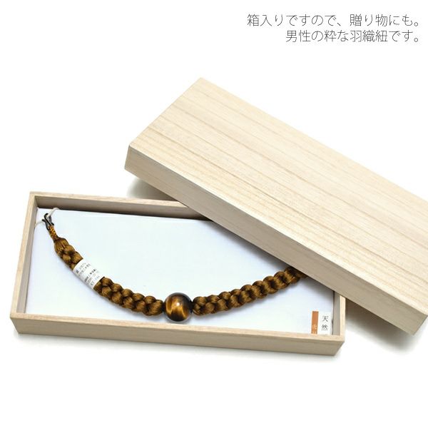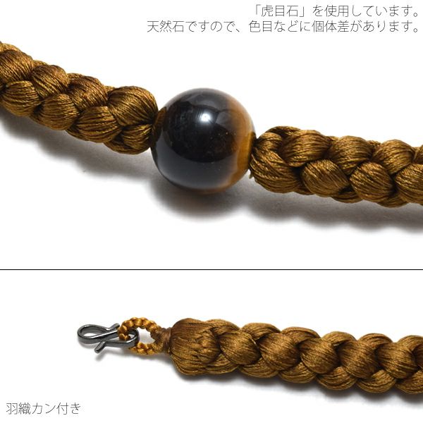 天然石「虎目石」の男性用羽織紐です。虎目石(タイガーアイ)は、金運や仕事運を高めてくれるといこと、また、災厄を退け、成功をもた らすといわれている縁起の良い石です。お洒落なのはもちろんのこと、縁起物というのもいいですね。お着物のオシャレなアクセントととして。羽織カンがついていて、引っ掛けるだけで簡単につけていただけます。