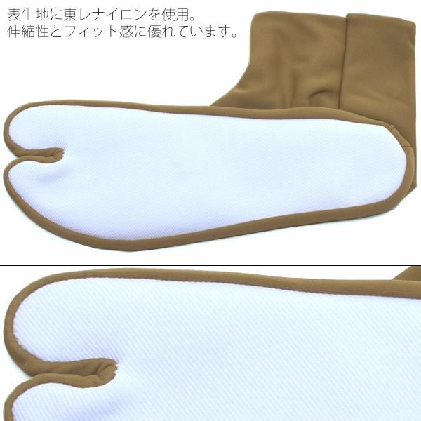 表生地は東レナイロンを使用しており、伸縮性とフィット感に優れ、履き心地良く、季節を問わず快適にご使用いただけます。裏生地と底生地の中側部分の直接肌に触れる部分は、肌触りの良い綿メリヤス生地を使用しており、5枚コハゼで足首までしっかりと包んでくれます。