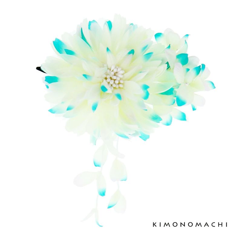 爽やかな色合いのお花に下がり飾りがかわいいお花髪飾りです。