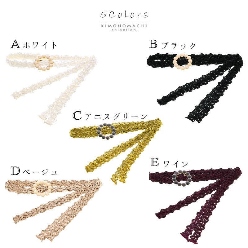 5. 帯締め 帯留め 2点セット 「ホワイト・ブラック・アニスグリーン・ベージュ・ワイン」 レース 帯〆 おびじめ 着物 浴衣 和装 和服 普段着 きもの カジュアル レトロ アンティーク 上品 洒落小物 【メール便不可】