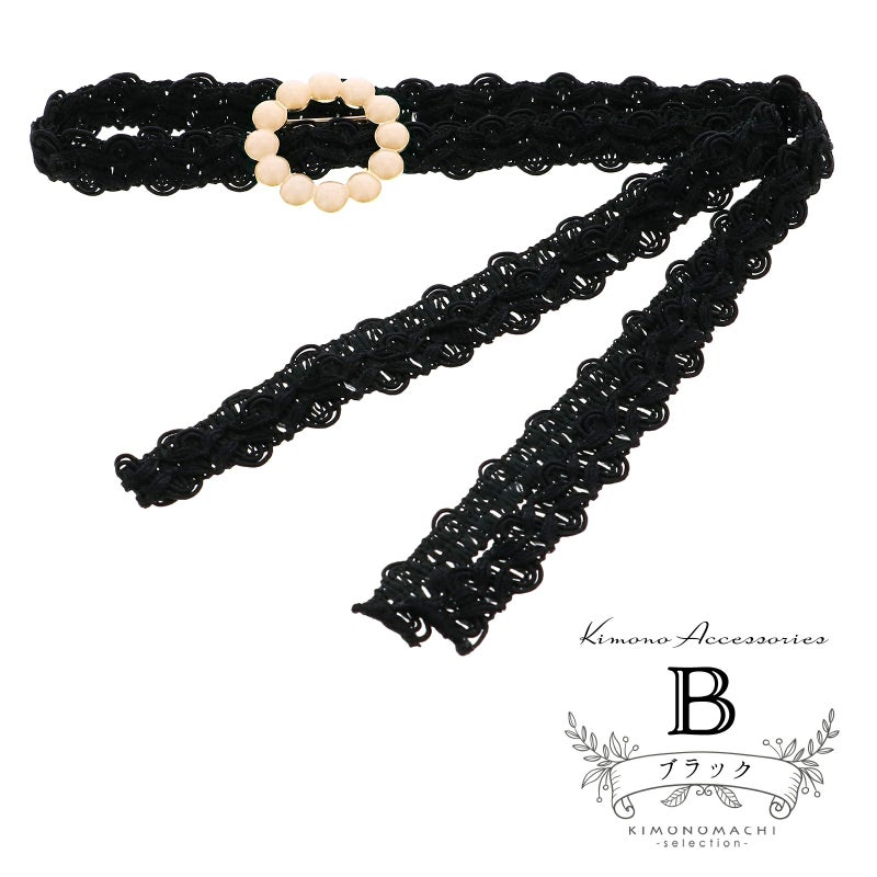 B.ブラック…黒の波型ブレードレースの帯締め。金色の金具にエクルベージュのシャボンリングの帯留。