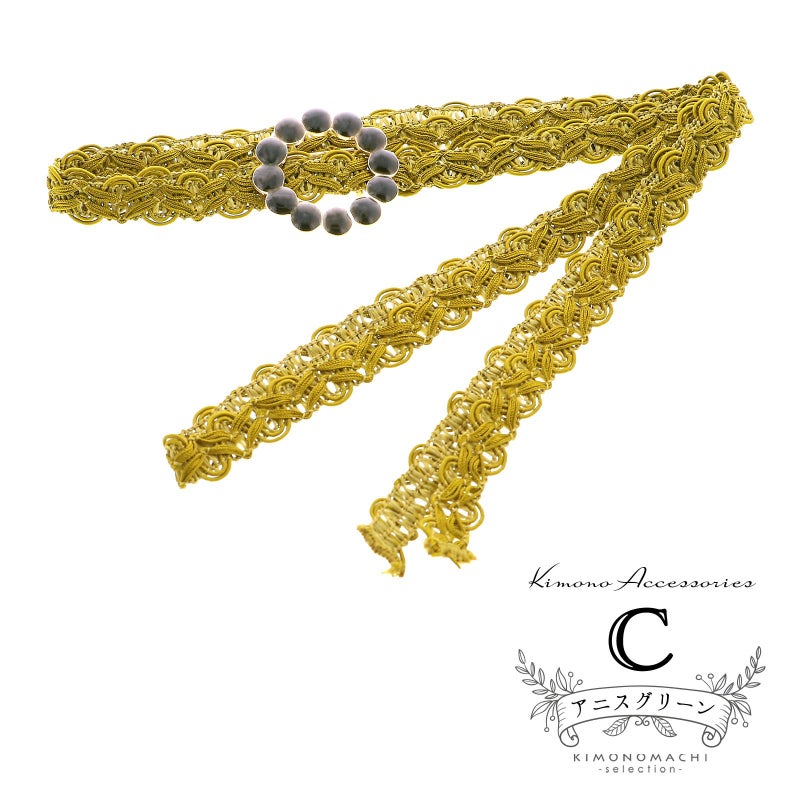 C.アニスグリーン…緑がかった深い黄色の波型ブレードレースの帯締め。金色の金具にチャコールグレーのシャボンリングの帯留。