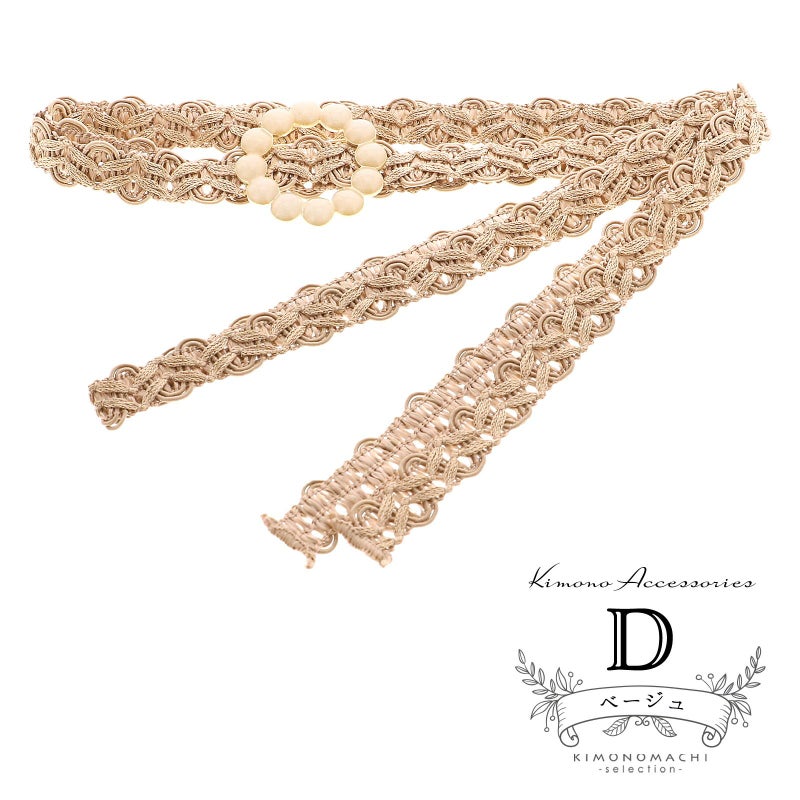D.ベージュ…シナモンベージュの波型ブレードレースの帯締め。金色の金具にエクルベージュのシャボンリングの帯留。