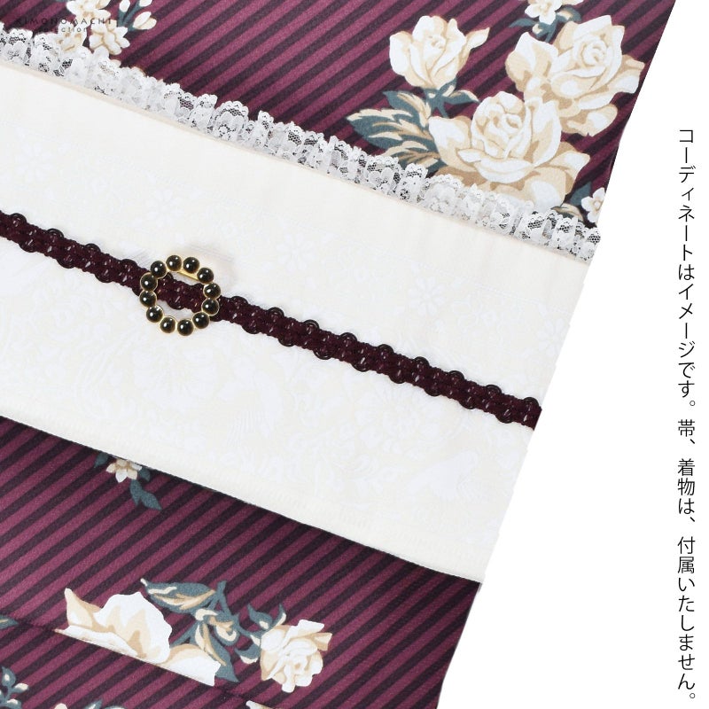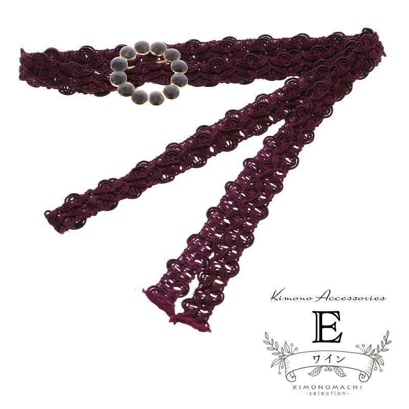 E.ワイン…深い紫色の波型ブレードレースの帯締め。金色の金具にチャコールグレーのシャボンリングの帯留。