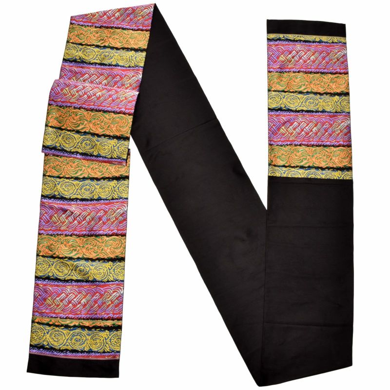 黒地に、藍色と黄色、鈍い青紫と赤茶、緑と橙色の抽象的な文様を横段に構成した帯。曲線を交錯させた芸術的装飾をモチーフにした連続模様は、とても複雑で緻密、着る人を個性的に演出します。