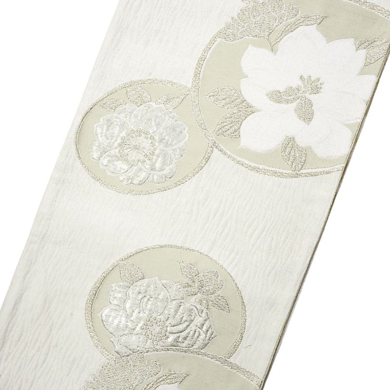 (卒業式応援10%OFFCOUPON1/22迄)振袖 袋帯 単品「白地、銀×灰色 丸に花紋」日本製 お仕立て上がり 振袖用 袋帯 お仕立て済 振袖帯 結婚式 成人式 フォーマル【メール便不可】