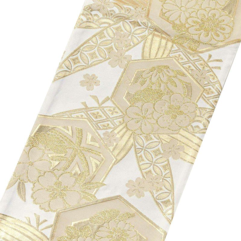振袖 袋帯 単品「白×金 笹に亀甲、花」六通柄 日本製 お仕立て上がり 振袖用 袋帯 お仕立て済 振袖帯 結婚式 成人式 フォーマル【メール便不可】