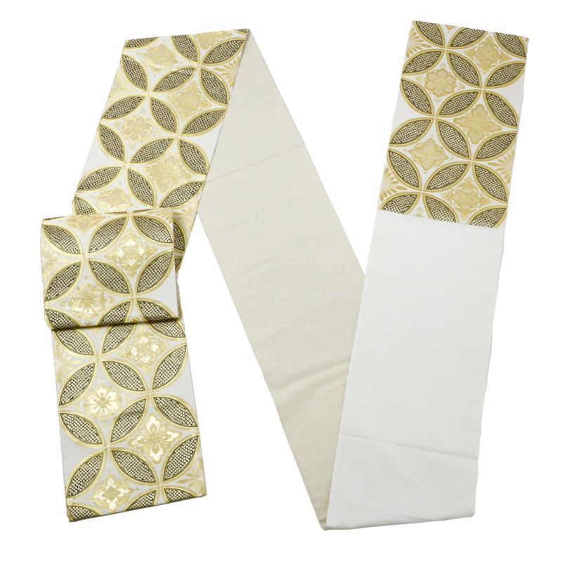 (成人式卒業式最大70%1/8迄)振袖 袋帯 単品「白地、金×黒 花七宝」日本製 お仕立て上がり 振袖用 袋帯 お仕立て済 振袖帯 結婚式 成人式 フォーマル【メール便不可】