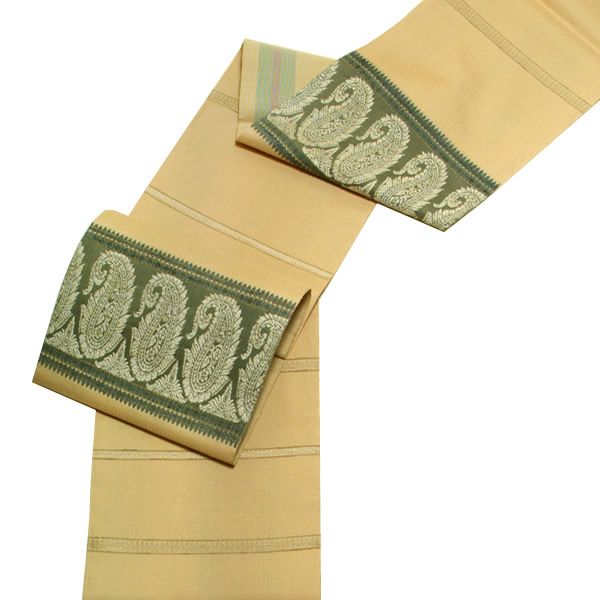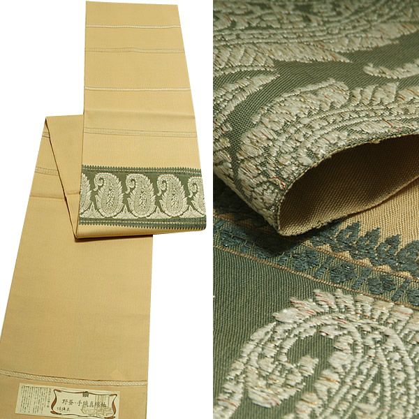 青みのごく浅い淡い緑色に白色、くすんだ浅い青色で刺繍を施したようなペーズリー、段模様。ところどころの金糸、赤色のラメ糸使いが控えめながら、華やぎをプラスしてくれています。