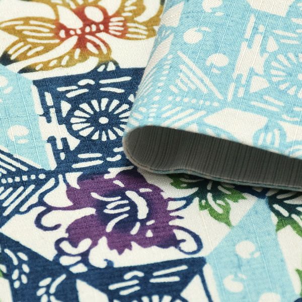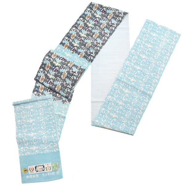 お太鼓、胴の柄部分は、淡い生成り地にブルー系に色使いの幾何学更紗模様。
