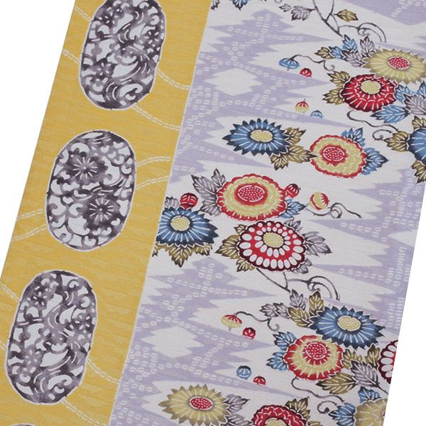 薄い黄色にグレーの色使いの丸に流水、花模様。