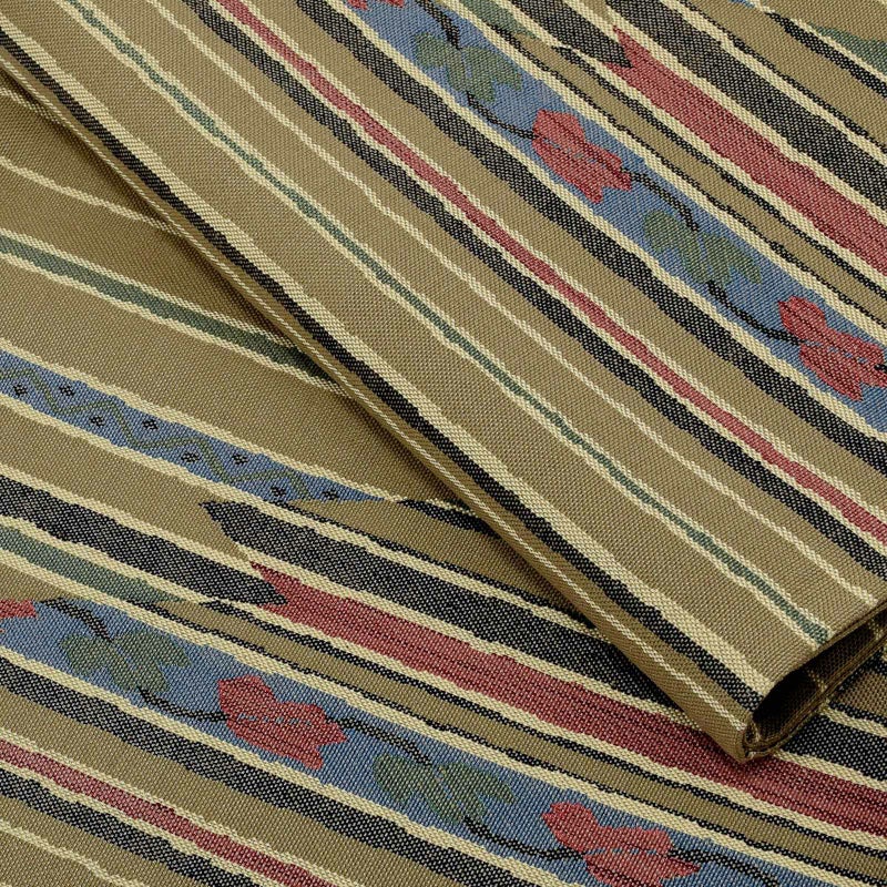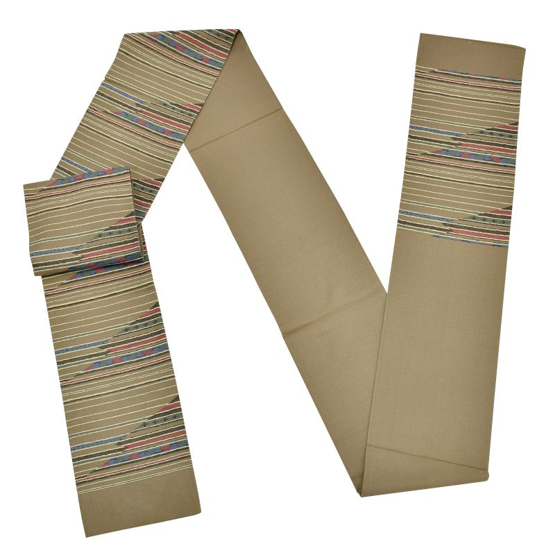 【色柄】利休色の地に浅いベージュの横線。深い抹茶色、浅い朱色、鈍い青など。斜めに切り替わる色が、山の遠景のような印象です。