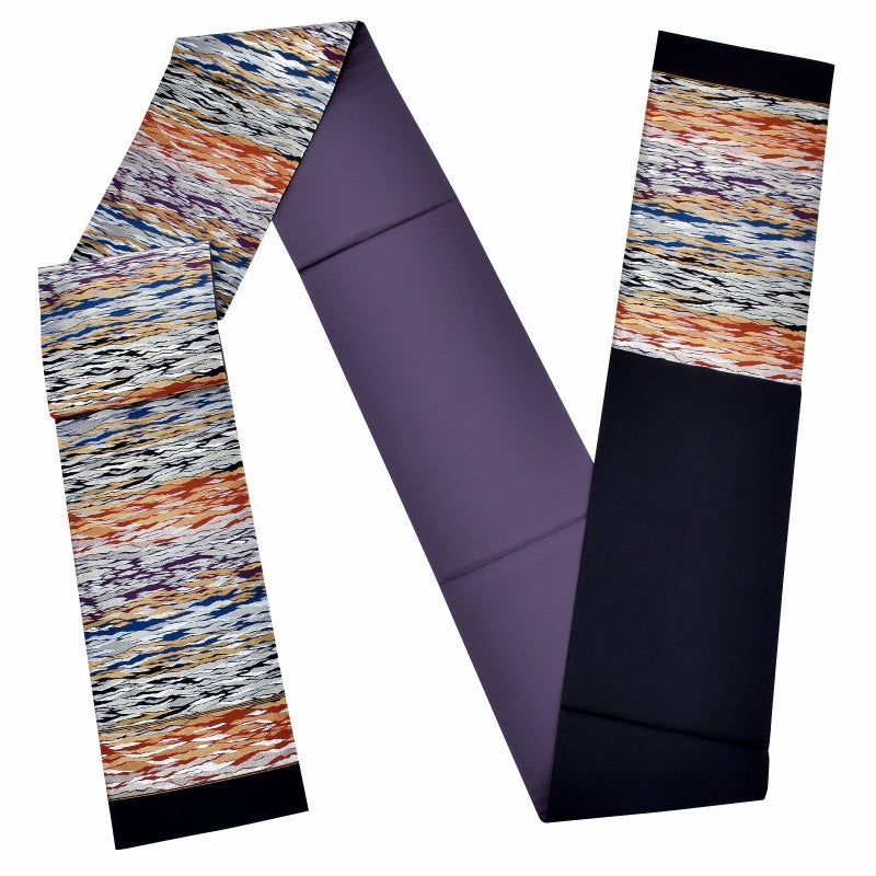 【色柄】深紫色、紺青、黒、赤茶色の横段の地に、シルバー、ゴールドの霞が全体に織り出されています。