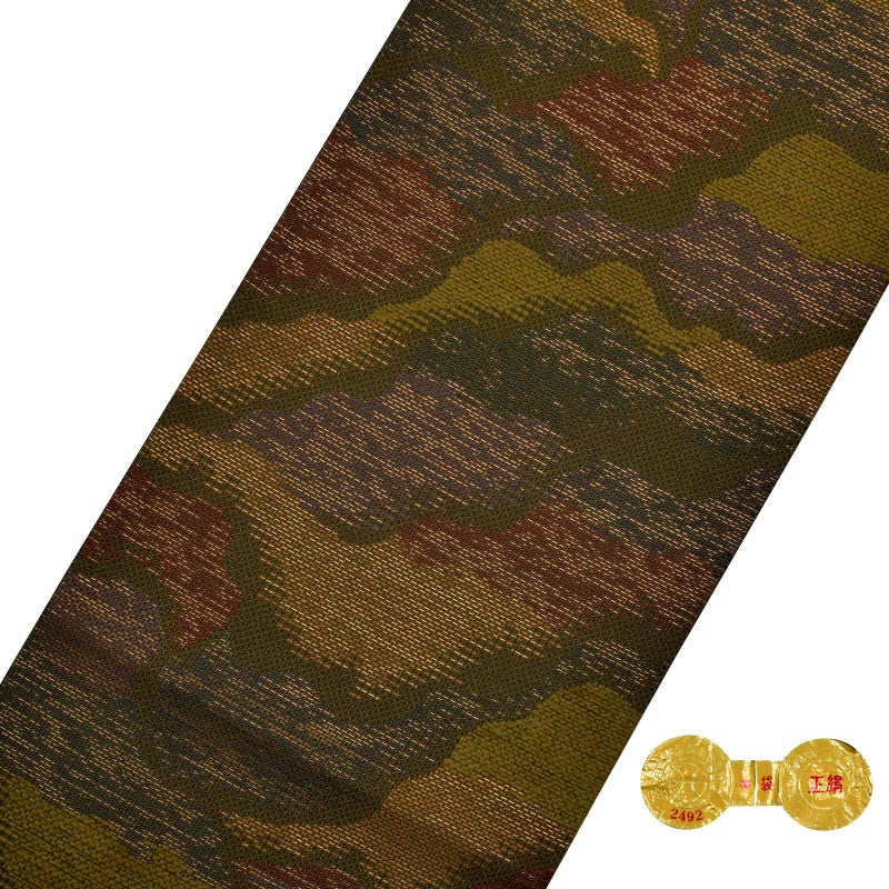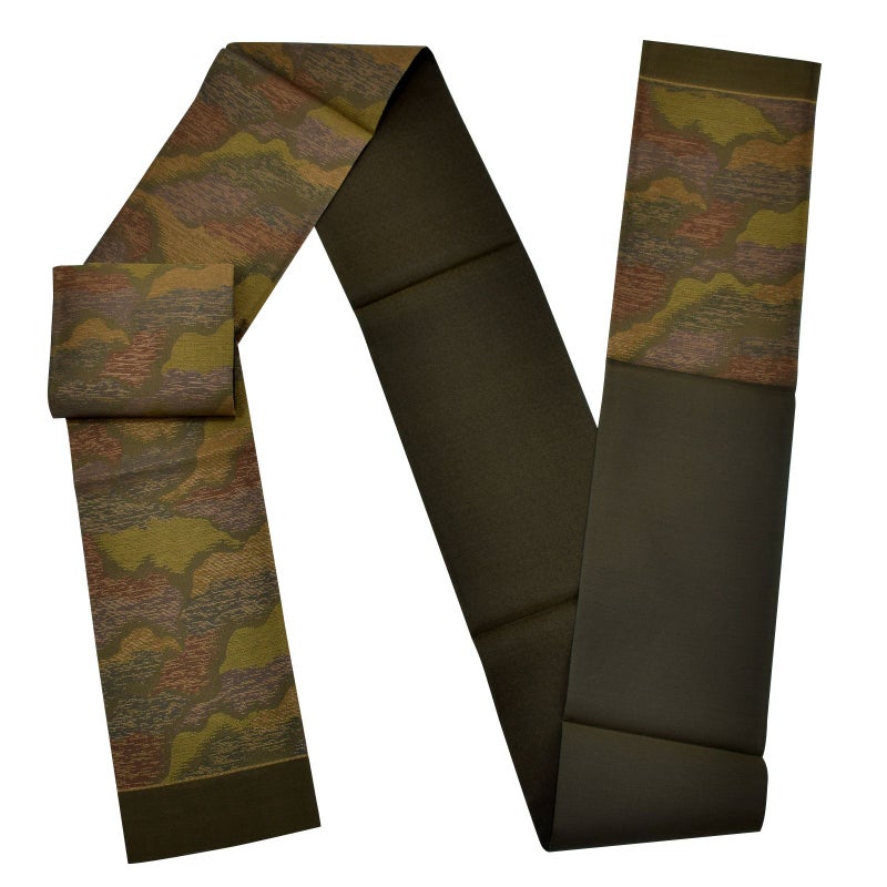 【色柄】深い黄緑色系の羅織の地に、黄土色、茶色、抹茶色で表現された霞のような抽象的な文様。抹茶色のモール糸を織り込み、個性的な風合いと高級感を演出しています。