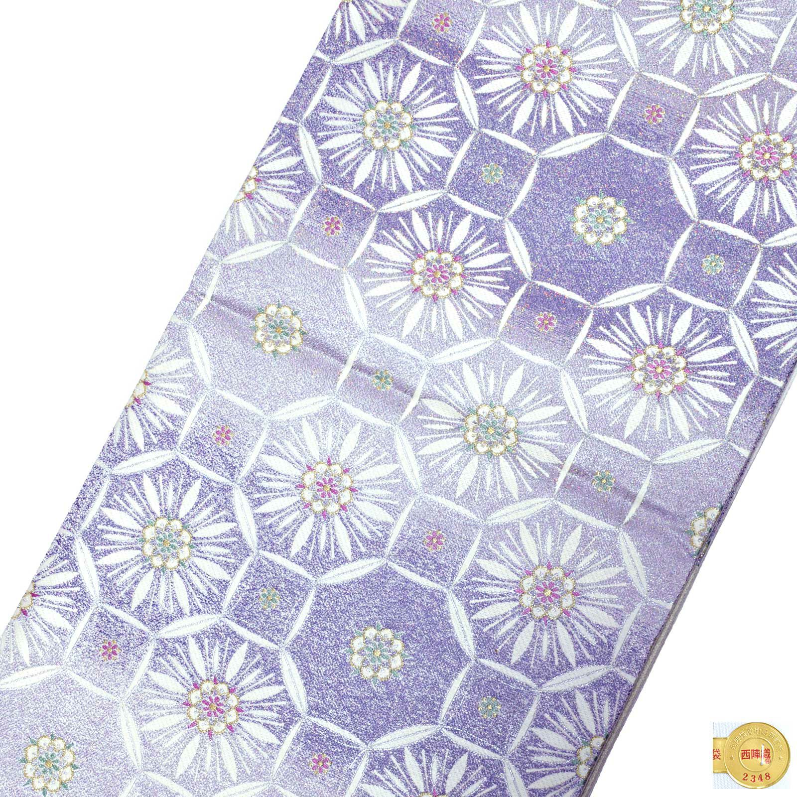 淡い灰色地に藤色を横段にぼかしたように織り出した地。特殊な箔と金銀糸や色絹糸を巧みに使用した変わり綴れの織物です。まるでさざなみのようにキラキラと繊細に輝きます。図柄は現代的にアレンジされた華紋と、四角と八角形を組みわせた蜀江文様。白を基調に、浅緑色や薄紫色など。モダンですっきりと華やかな雰囲気です。