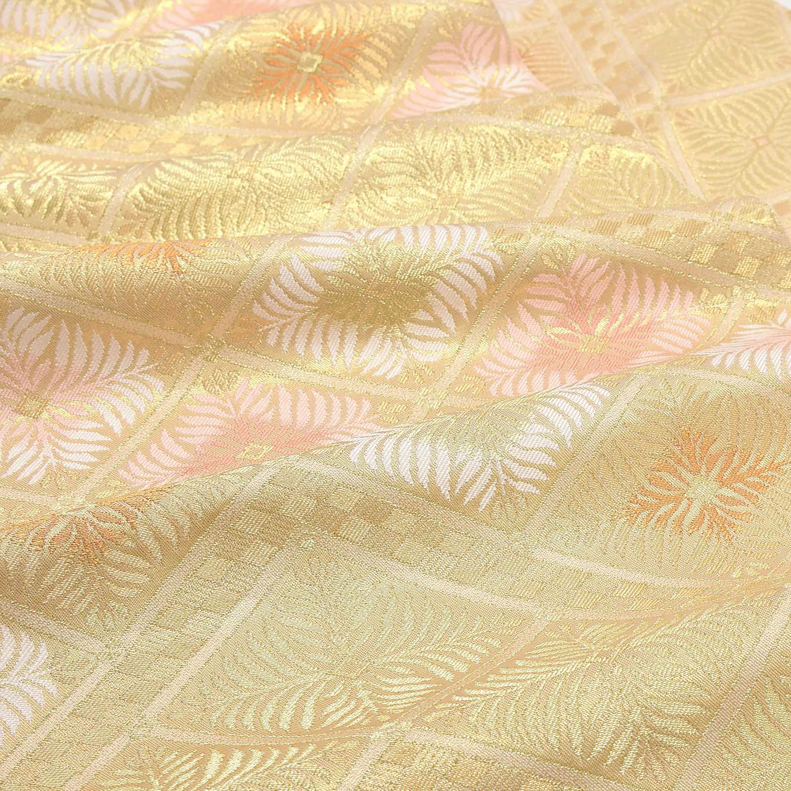 落ち着いたゴールドの地に金、白、朱鷺色の松菱文。方形に連なった松菱の合間を通る細かな市松文様が洒落感を添えます。気品と雅やかさを湛えた高級感のある帯です。