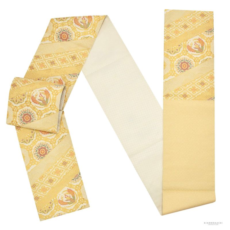 【色柄】輝きのある金とアイボリーが美しい帯地に、鳳凰と唐花が豪華絢爛な袋帯。鳳凰と唐草文様の一種である宝相華が豪華に織り上げられており、気品と風格があります。幸菱や波文様も、ゴールドととても良く調和しており豪華絢爛たる気品がある帯です。