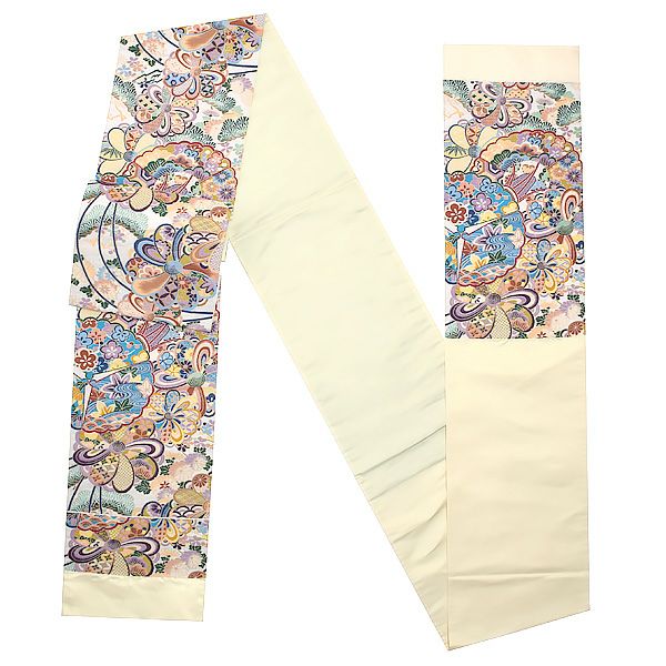 柔らかな生成り地に色彩豊かな吉祥草花模様。