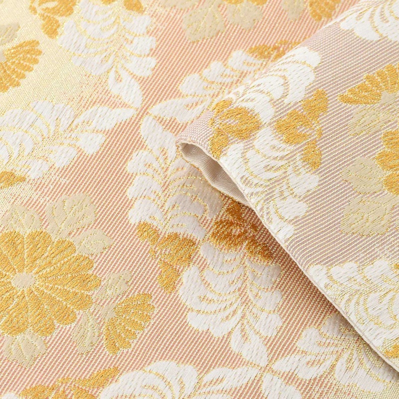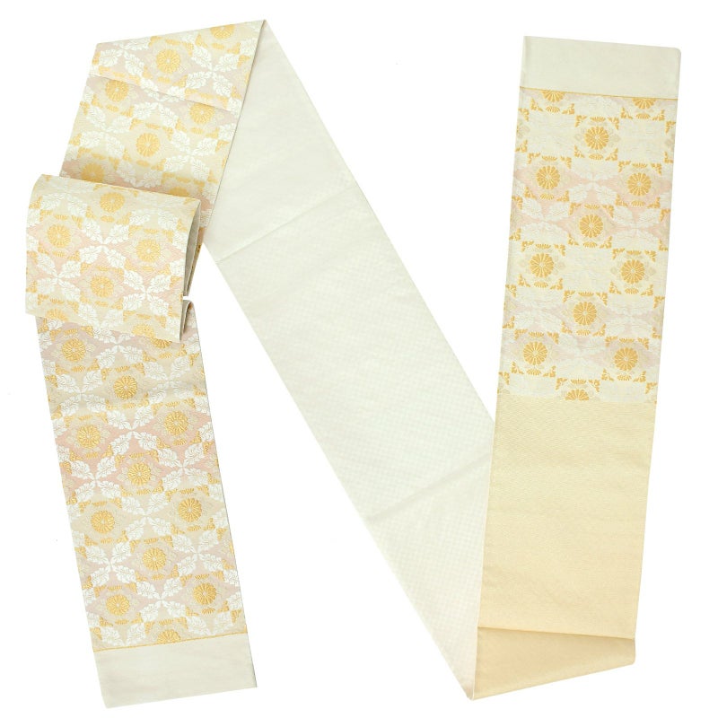 淡いベージュの地に、ごく淡い灰みの藤色と淡いピンクの横段。白と金の華紋を七宝文様の形に織り出した変わり七宝。中に金の菊花の文様。全体的にやわらかく落ち着いた色合い、白と金の上品な美しさが、礼装を格調高く優美に引き立てます。