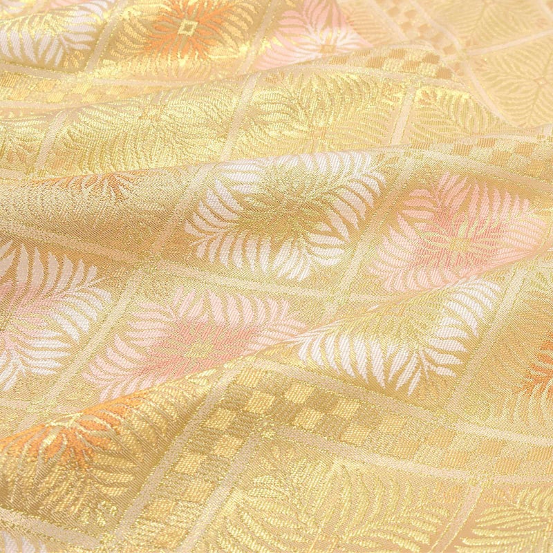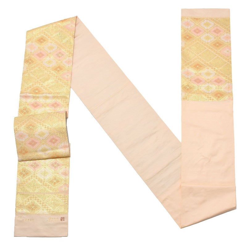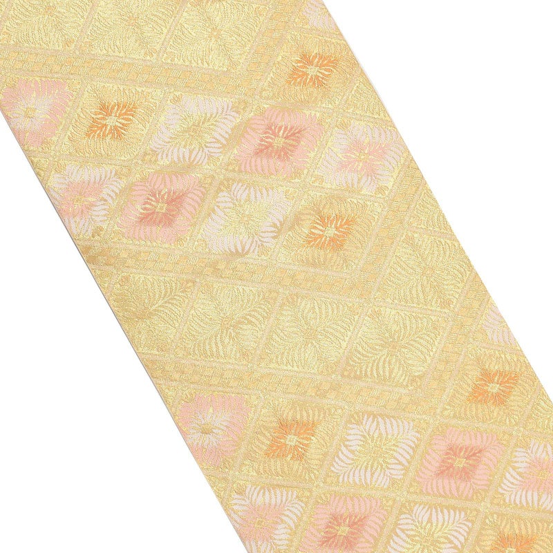 落ち着いたゴールドの地に金、白、朱鷺色の松菱文。方形に連なった松菱の合間を通る細かな市松文様が洒落感を添えます。気品と雅やかさを湛えた高級感のある帯です。