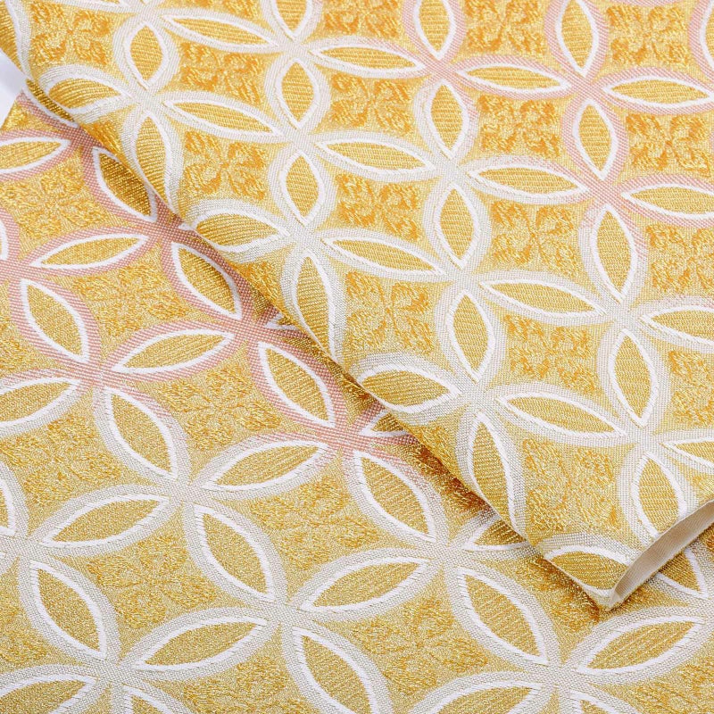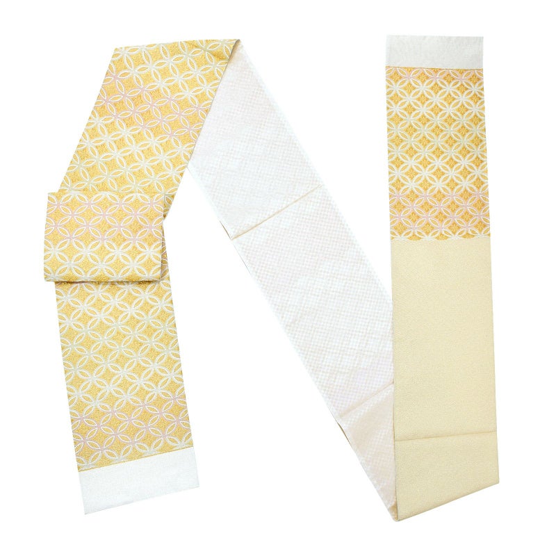【色柄】淡いピンクにゴールドベージュの段ぼかしに金通しの地。白とゴールドで花菱の入った七宝文様が表現されています。