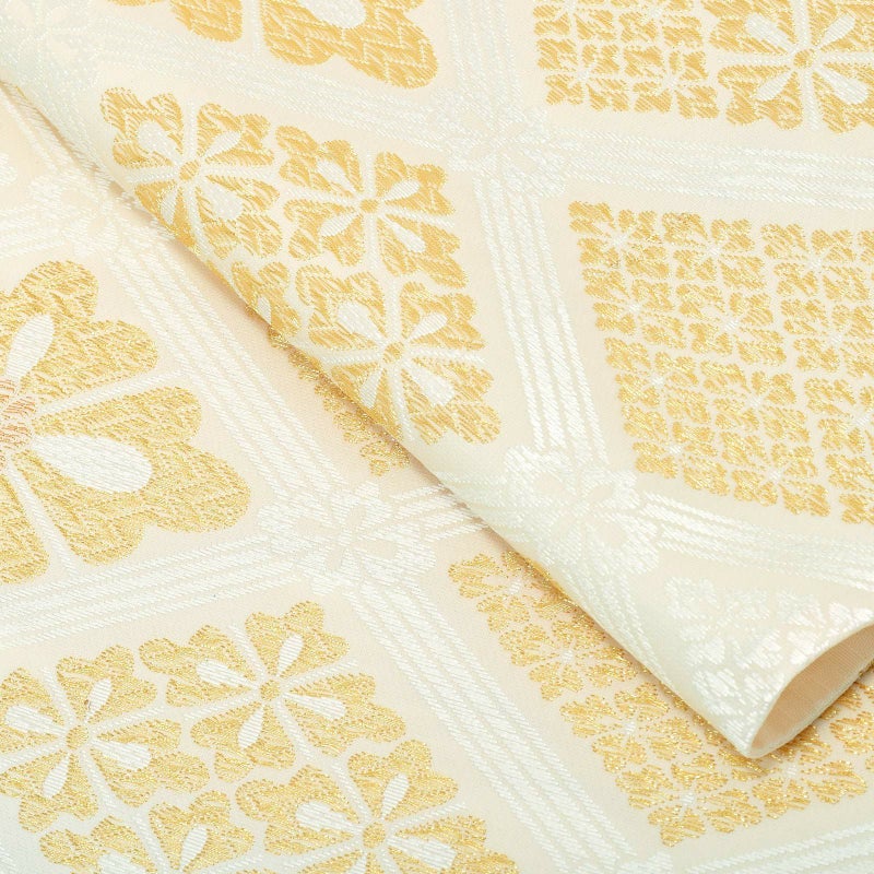 【色柄】アイボリーにシルバーグレーの段ぼかしの地。白の菱格子の中に、白やゴールドで大きな花菱や幸菱など様々な花菱文様が表現されています。