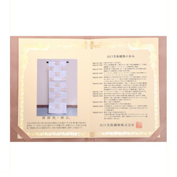 京都西陣で、日本が世界に誇り得る我が国の貴重な文化遺産である染・織・繍の最高峰の技術を、千二百年にも及ぶ歴史の中で禁裏の厚い庇護のもと、先達の技を継承、「紫雲会」同人の監修の許に、技術を駆使し創作した山口織物の逸品です。