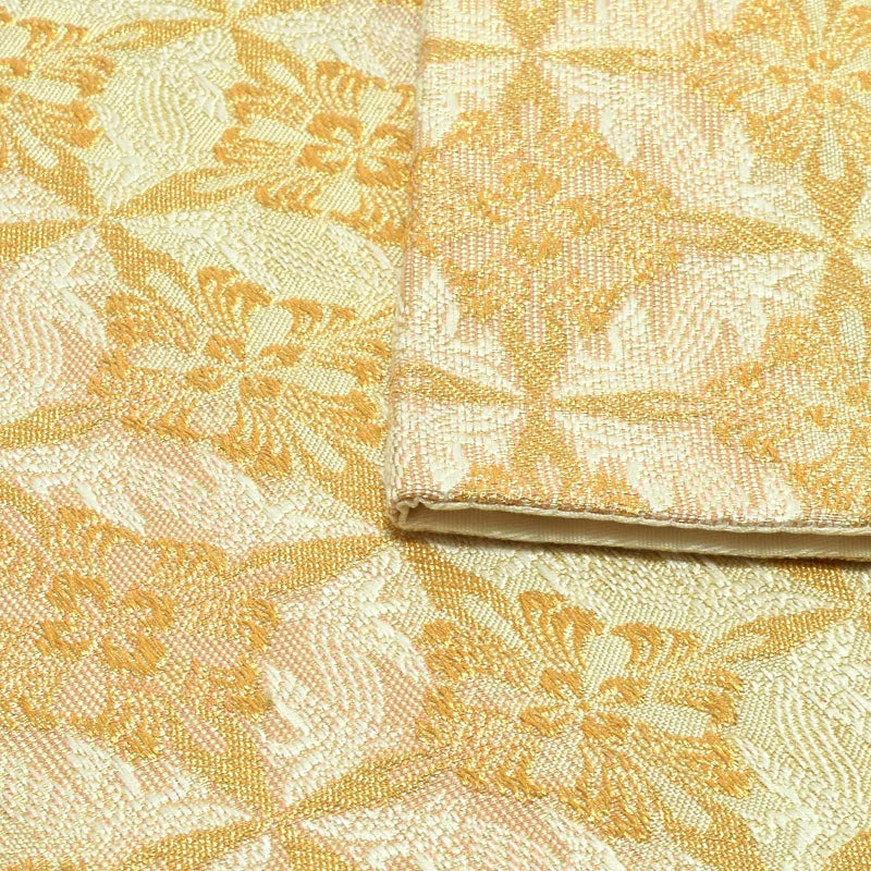 淡い生成り色にごく淡い桃色の横段の地。金を基調とした白の鳥襷文様の帯。金の花菱を中心に向かい合った尾長鳥を組み合わせた連続模様の鳥襷文様は、有職文様のひとつで、大変格調高い文様です。白と金の高雅な取り合わせに、ほんのりと色みを添えた、上品で合わせやすい帯です。