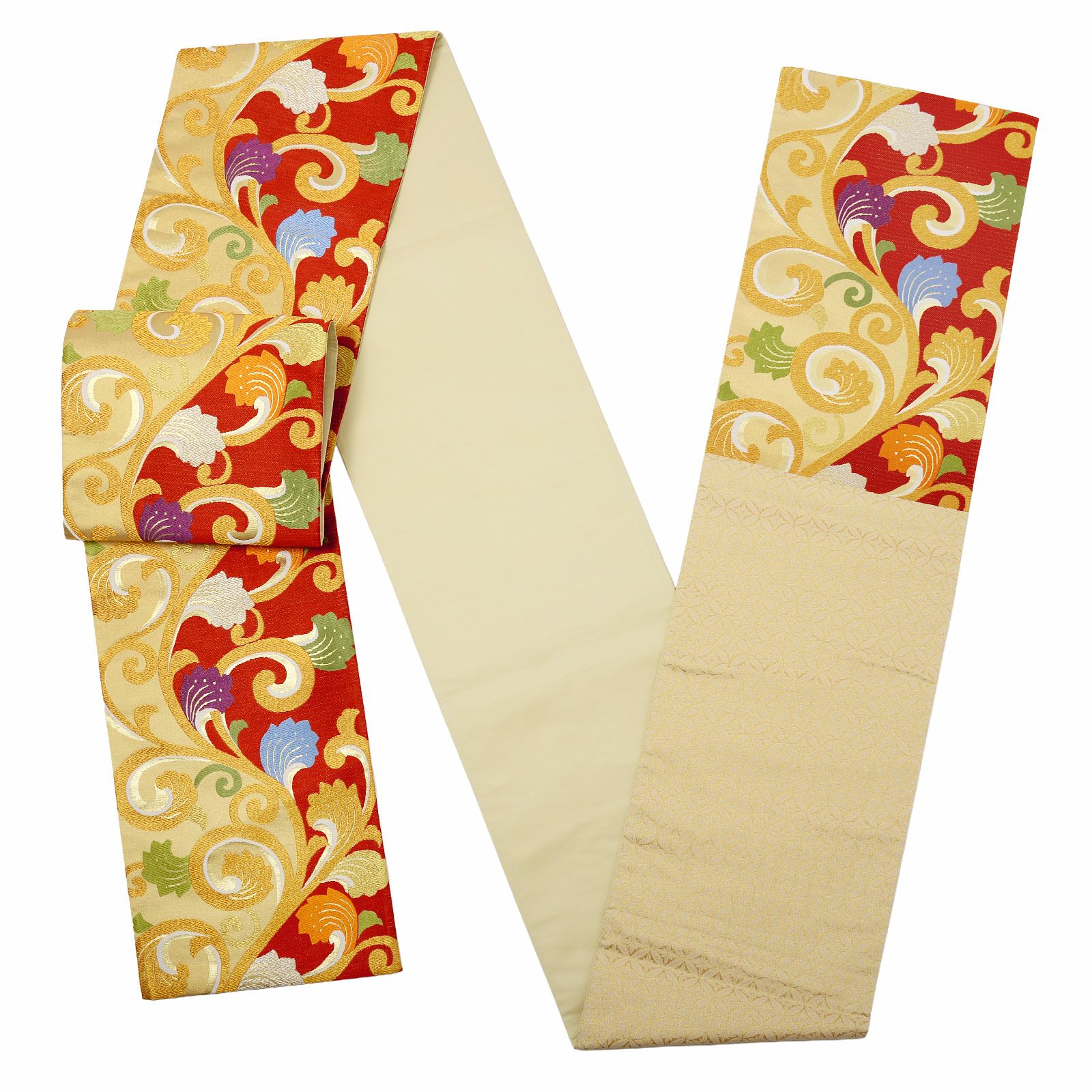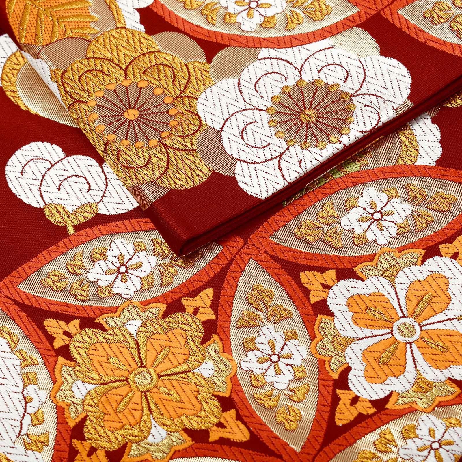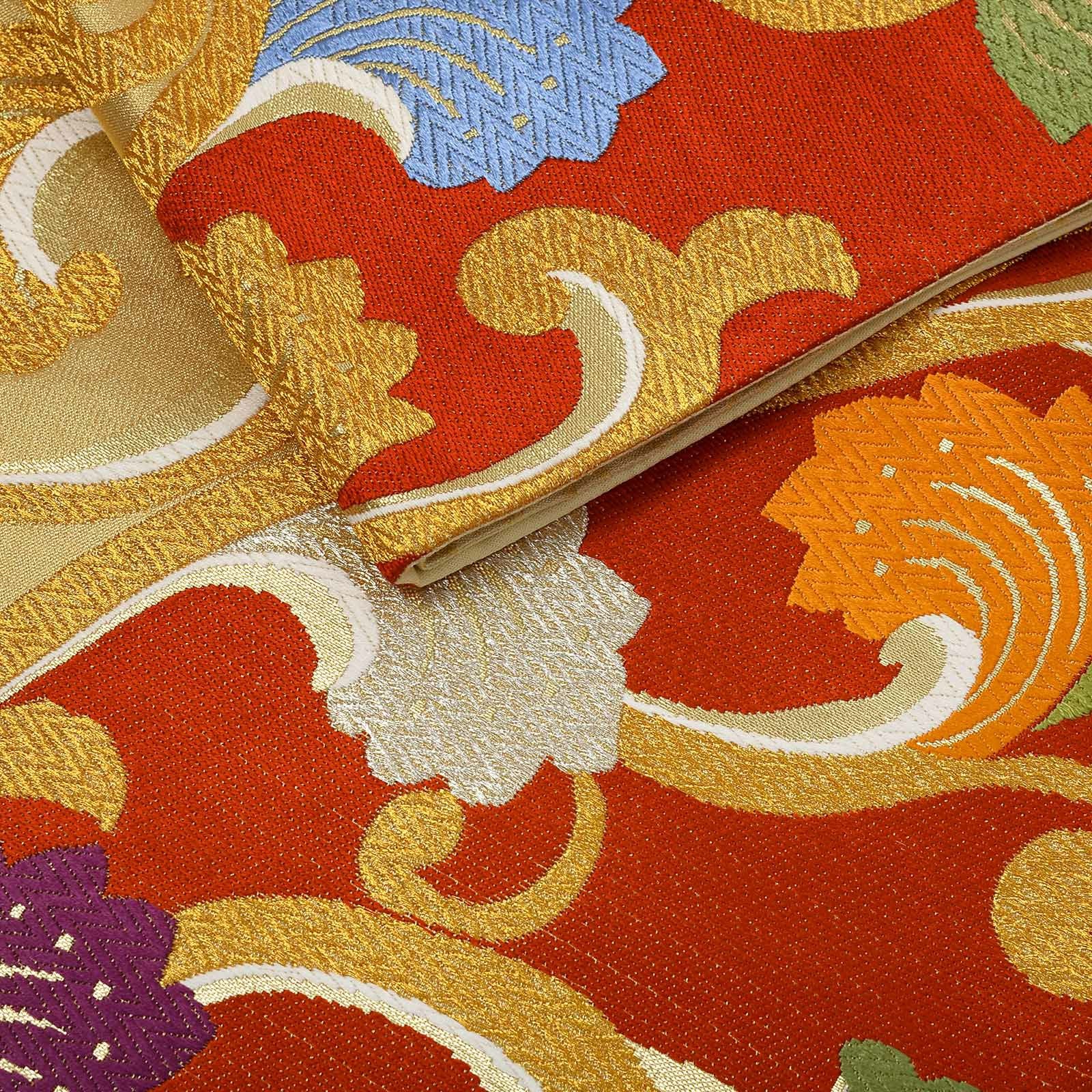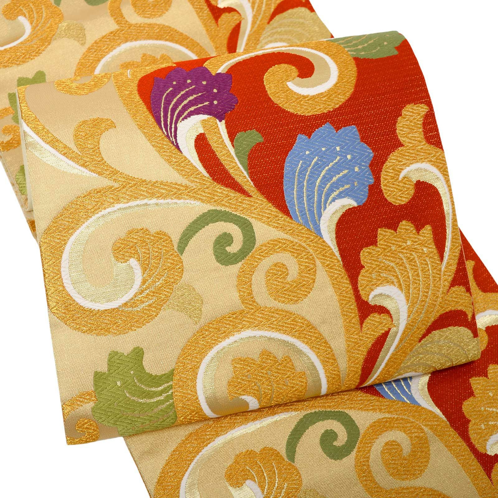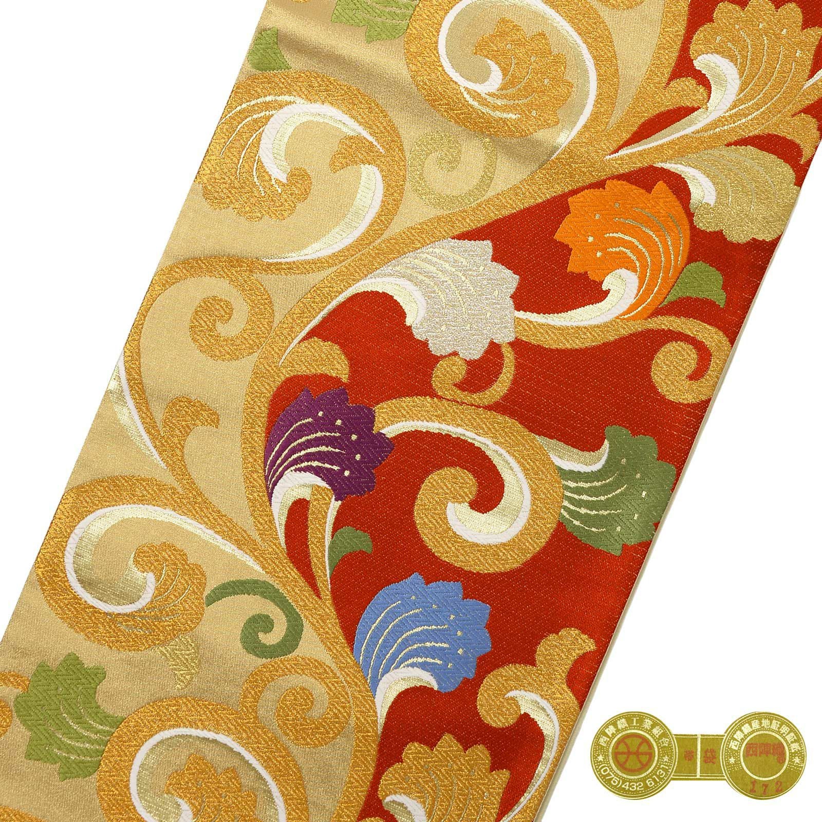 他の画像を見る 送料無料 華やかな振袖帯 袋帯 お手持ちの振袖、ママ振・姉振に合わせて 振袖 袋帯 単品「赤×ゴールド 唐草」日本製 西陣織 西陣織証紙番号 No.172 岡文織物株式会社 六通柄 お仕立て上がり 振袖用 袋帯 お仕立て済 振袖帯 結婚式 成人式 フォーマル【メール便不可】 きもの町価格 ¥ 39,800 税込 カートに入れる お気に入りに登録する