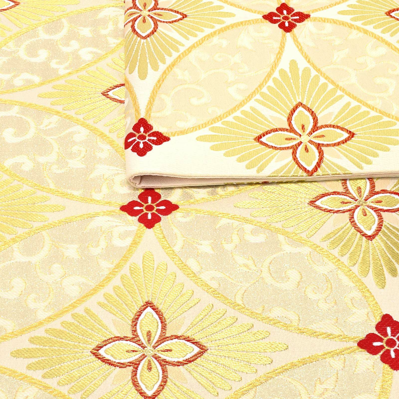 金通しの淡い生成り色の地に、イエローゴールドの花七宝文様。七宝の中心に菊の花弁をあしらった花菱紋。ゴールドを基調とした大胆な七宝文様に、花菱の赤がアクセント。合わせやすく、若々しく華やかな印象にしてくれる帯です。