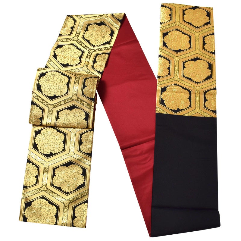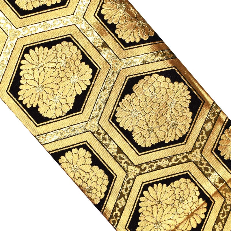 【色柄】ゴールドに黒で表現された八重菊の詰まった大きな亀甲文様、合間に花唐草。