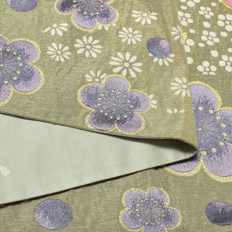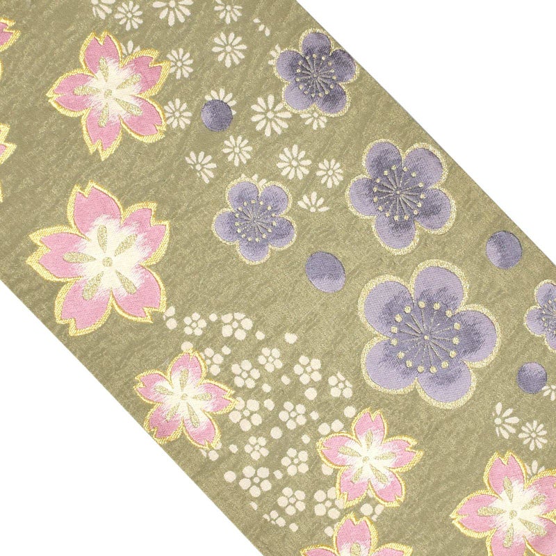 【色柄】金通しのグレイッシュな緑色の地。生成り色にピンクの桜と、グレイッシュな青紫色の梅が縦方向に散らされています。生成り色の菊や小梅。ポイントにゴールド。