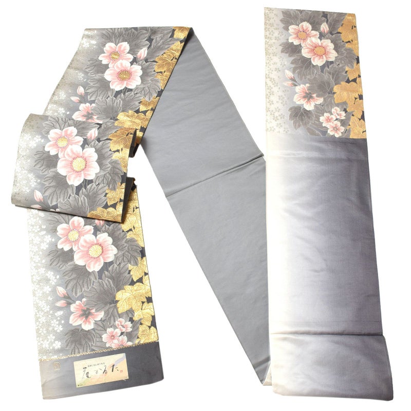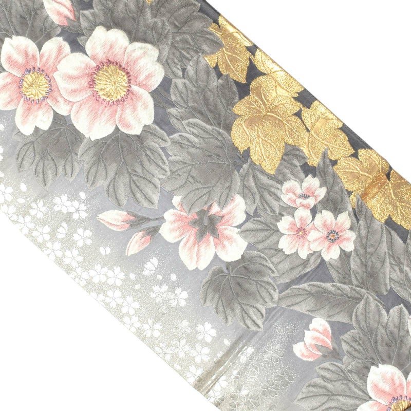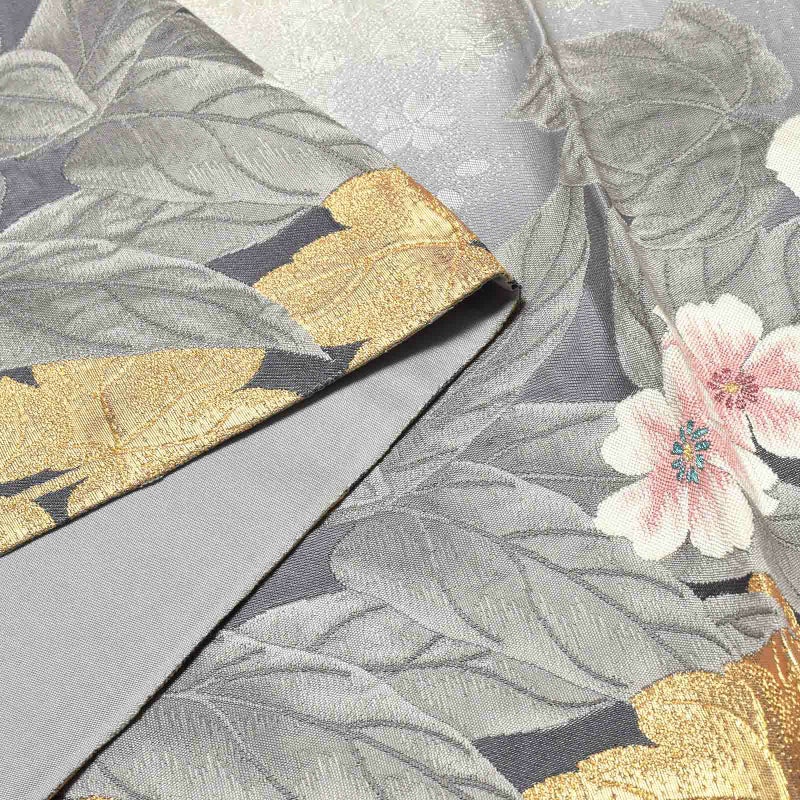 【色柄】グレー地に淡いグレーの片ぼかし。芙蓉のような銀鼠色とゴールドの葉に、白に淡いピンクの花文様が全体に織り出されています。花の中心にゴールド、ピンクや紫の蕊。淡いぼかしの部分には、シルバーグレーの小桜。