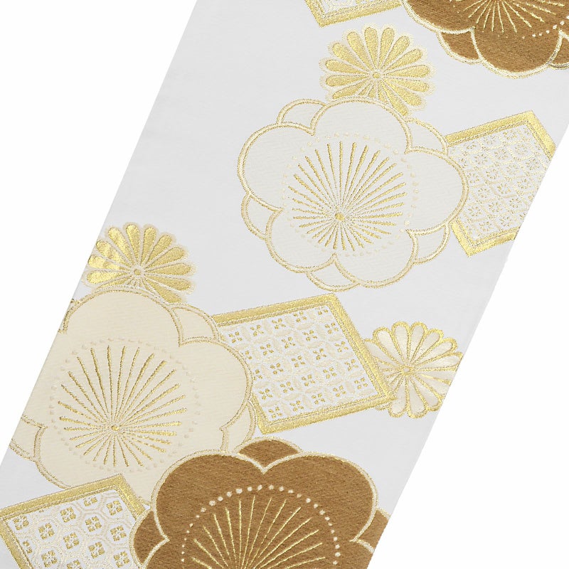 振袖 袋帯 単品「白地、金×香色 菱に梅菊」日本製 お仕立て上がり 振袖用 袋帯 お仕立て済 振袖帯 結婚式 成人式 フォーマル【メール便不可】