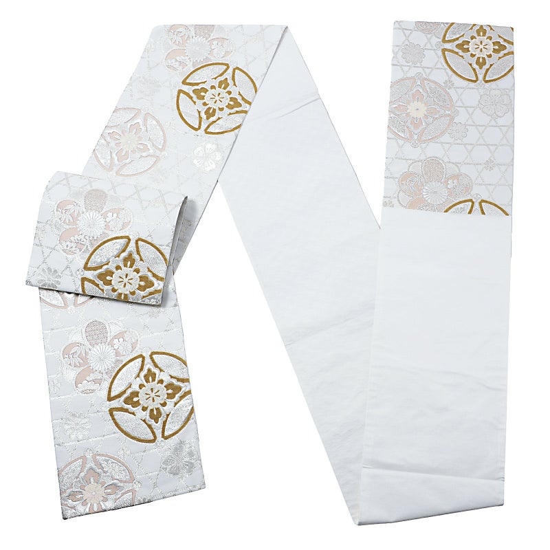振袖 袋帯 単品「白地、銀×茶 籠目に七宝、花紋」日本製 お仕立て上がり 振袖用 袋帯 お仕立て済 振袖帯 結婚式 成人式 フォーマル【メール便不可】