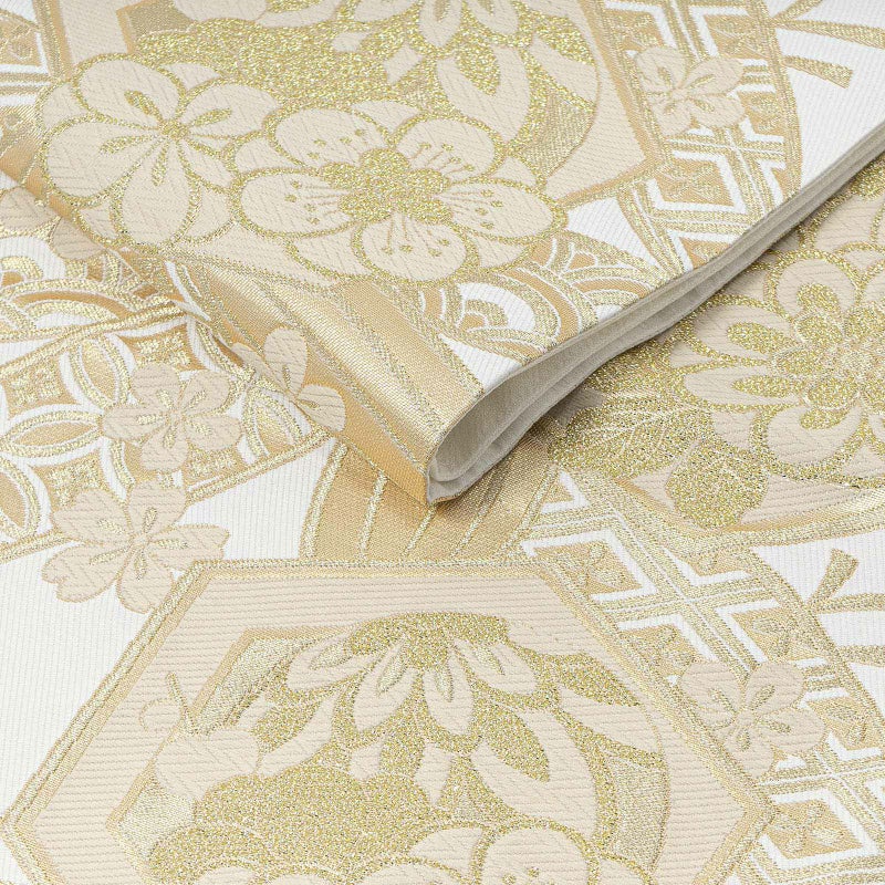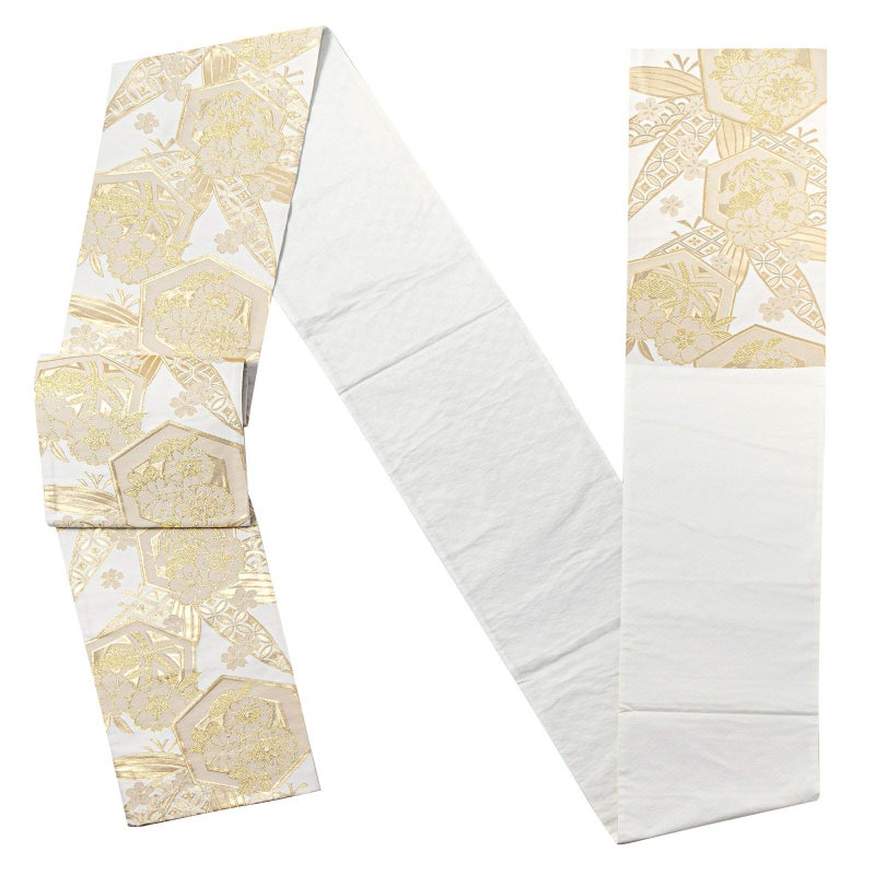 振袖 袋帯 単品「白×金 笹に亀甲、花」六通柄 日本製 お仕立て上がり 振袖用 袋帯 お仕立て済 振袖帯 結婚式 成人式 フォーマル【メール便不可】