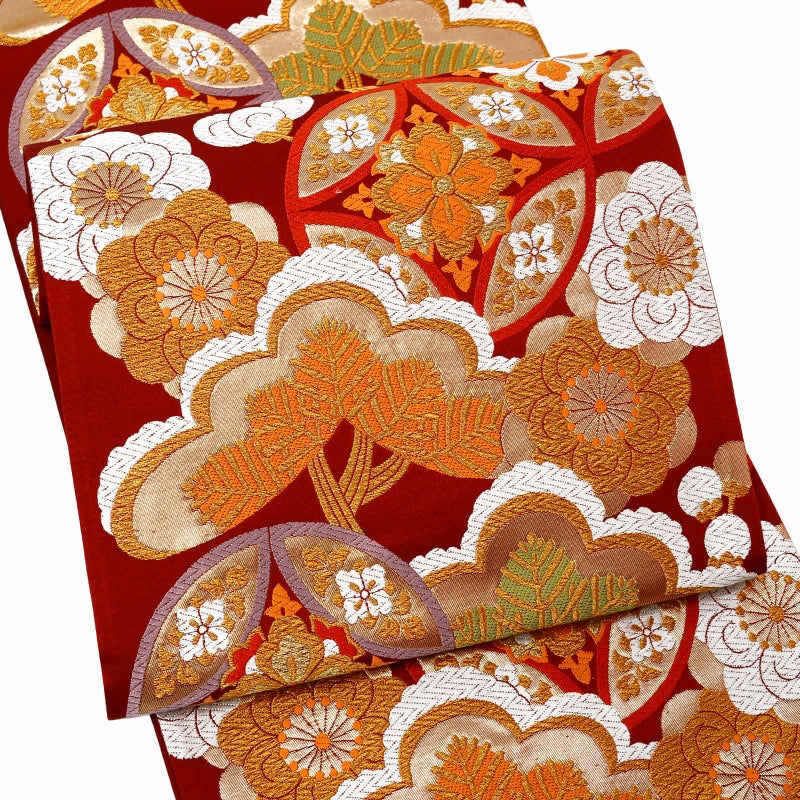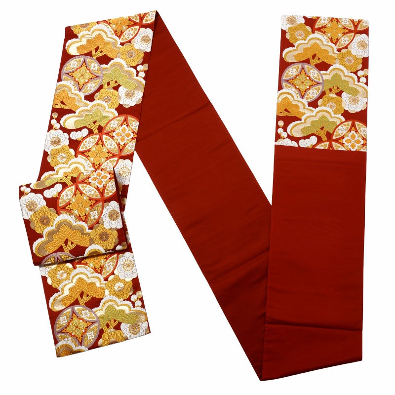 【色柄】濃い赤地に赤、藤色、白、橙に浅い緑、ゴールドの配色。花入り七宝に大きな松、梅紋が散らされています。