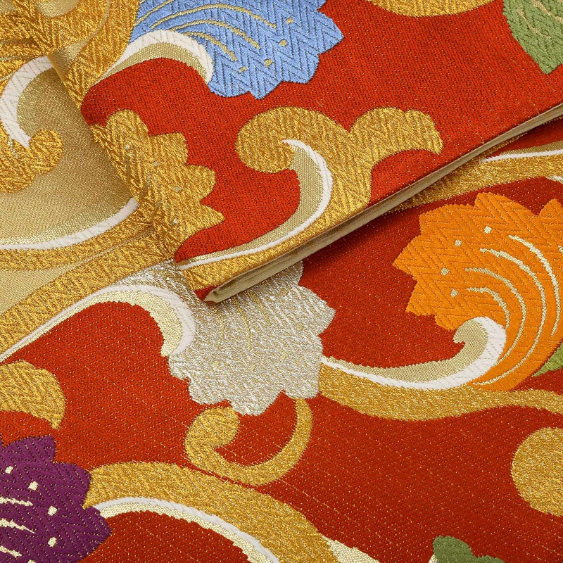 【色柄】ゴールドの大きな唐草によって片側は赤、片側はベージュゴールドに区切られた地。金銀、浅緑、浅い青、深紫、橙の唐草に葉。