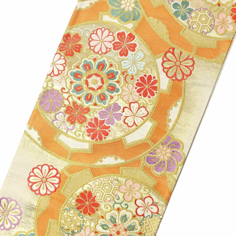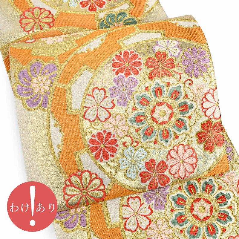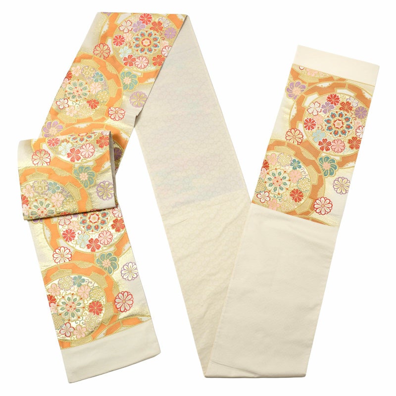 【色柄】オフホワイトにゴールドを織り込んだ地。ゴールド、白、橙の大きな源氏車の中に、淡いピンクや紅赤、灰緑、藤色などの唐花や雪輪などが配されています。花紋が散らされた可愛らしい印象の帯です。