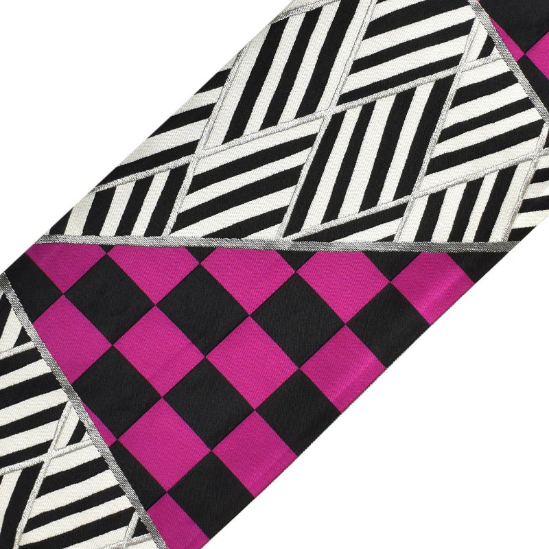 【色柄】濃い紫と黒の市松模様。銀のラインで三角に区切った中に、縦横に向きを変えた黒と白の縞模様が。大胆で個性的なデザインとはっきりとした色遣いが、晴れ着を鮮やかに際立たせてくれます。晴れの日を彩る振袖に。お手持ちの振袖に合わせて、また、ママ振や姉振に合わせて、自分だけの装いに。成人式、結婚式などのおめでたい席の振袖に。上品な華やかさを演出してくれます。